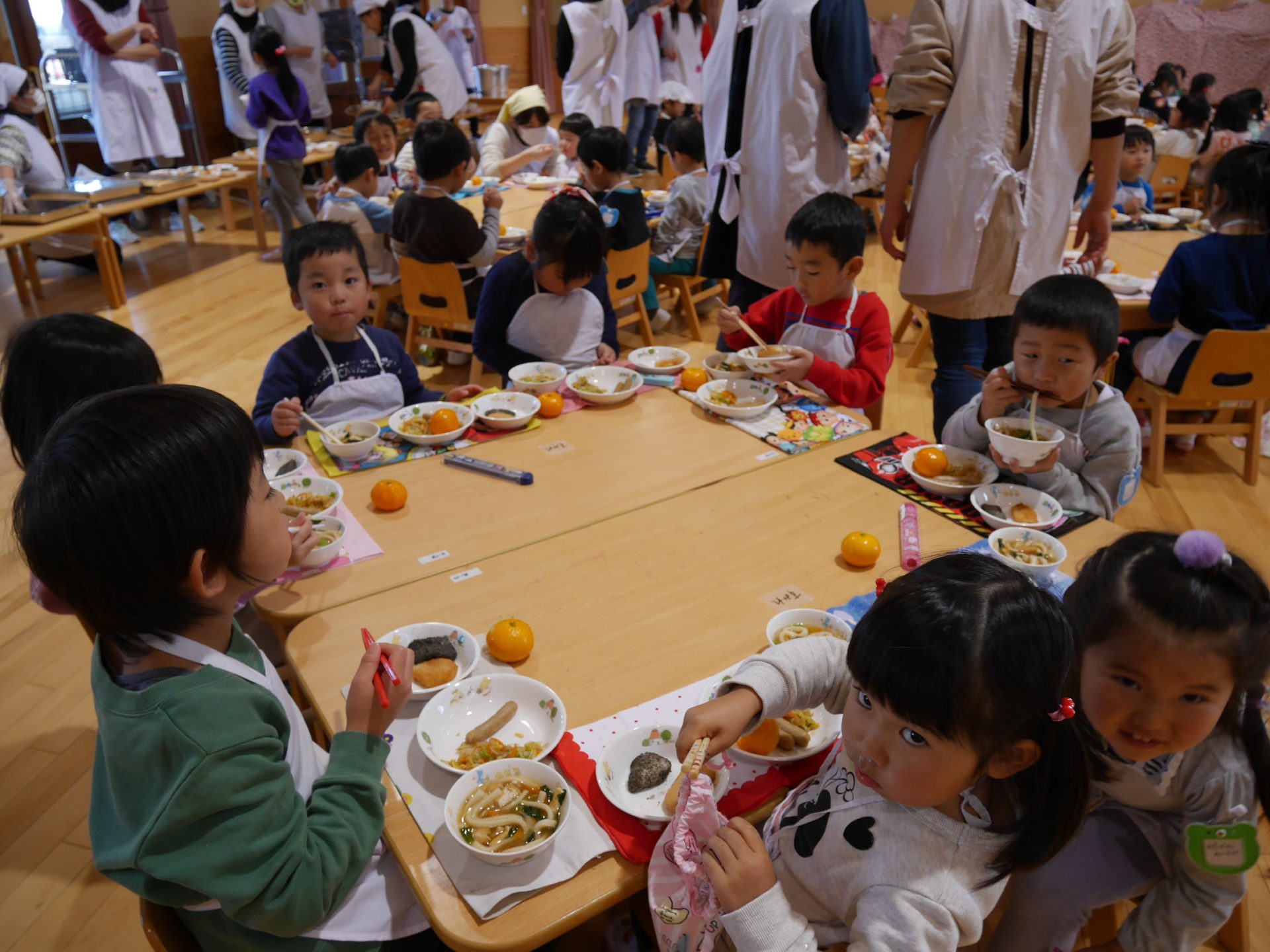 「ご飯が伸びてる」「甘いね」「いっぱい噛んでるとお餅の味がする!」子どもたちは五感で