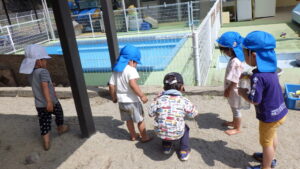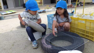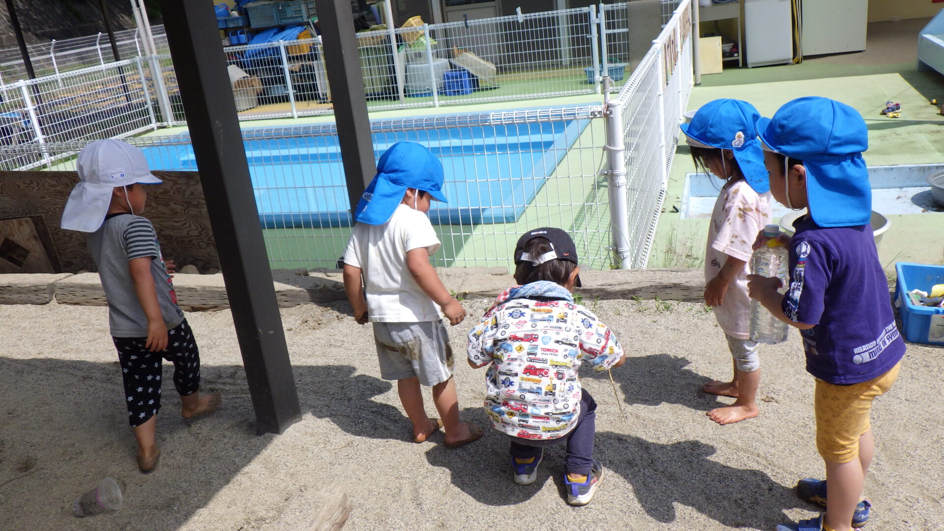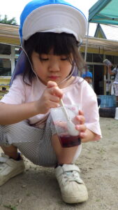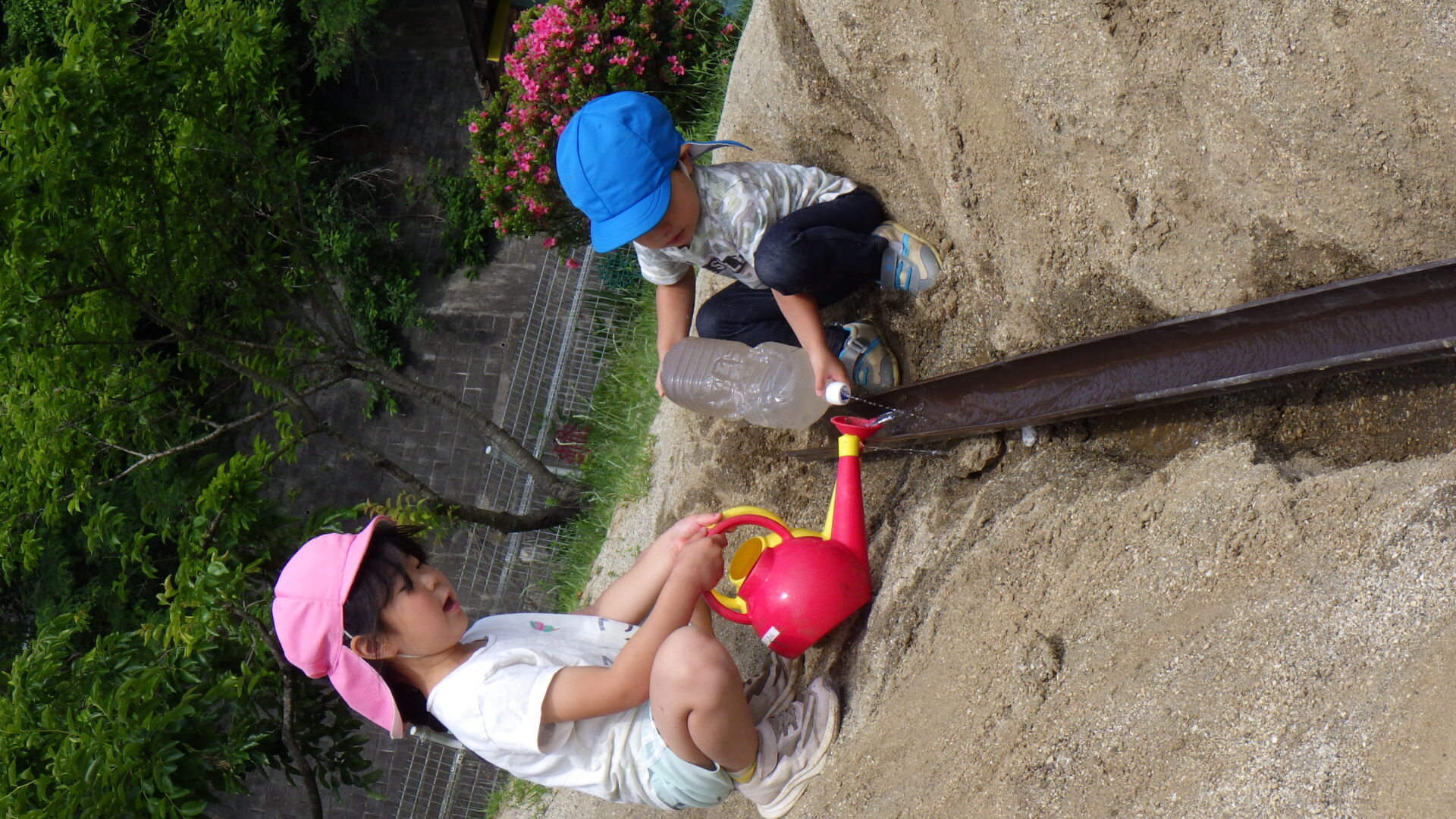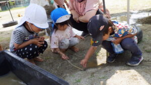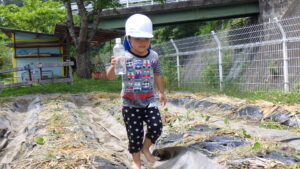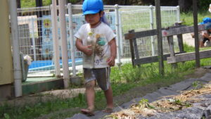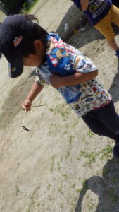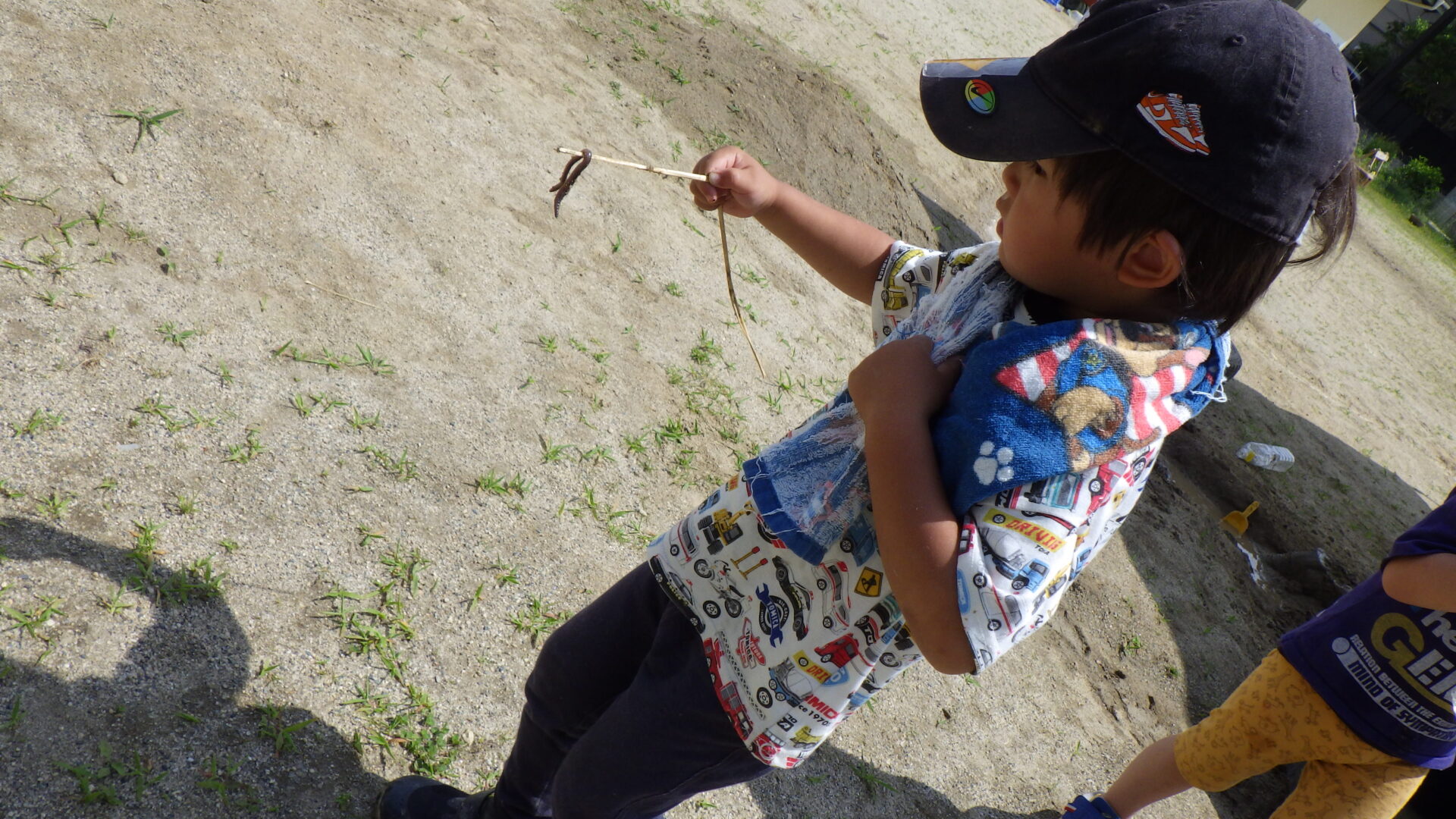しかし、手にしっかり水を抱えた年少さんは、芋畑を越え、ミミズに水をかけていました💦「動かんなあ」「あ、動いた!」「水飲んどる?」と・・・何度も水を汲みに行っては水をあげていました。
