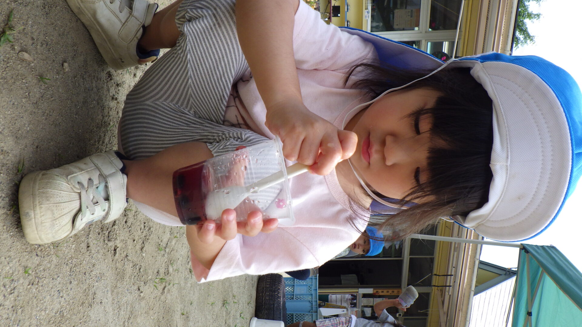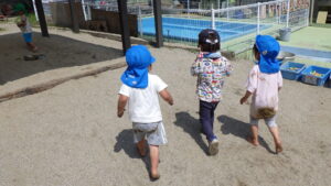 スクッと立ち上がり走りだした年少さん達。「きっと水を汲みに行ったのだろう」と思い待っていると、やってきました。張り切って水を汲んできた年少さん達。