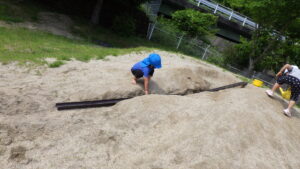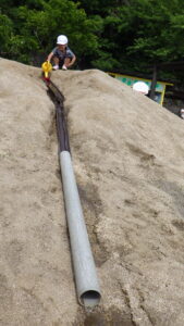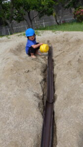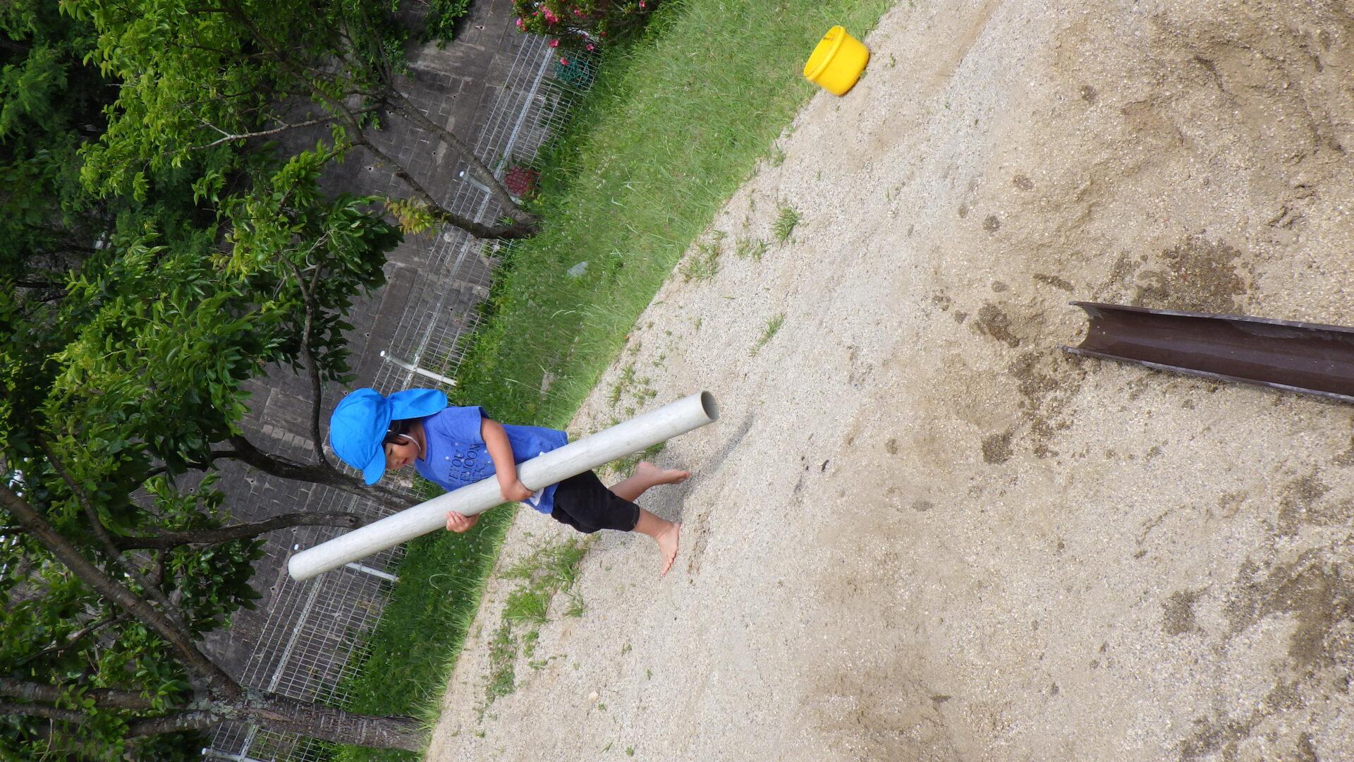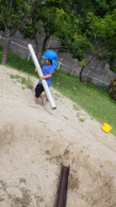 「よし!」と思ったのか、今度は塩ビパイプを運んできました。トヨも塩ビパイプも年少児の背よりも長く、それを持って築山を登るのです。
