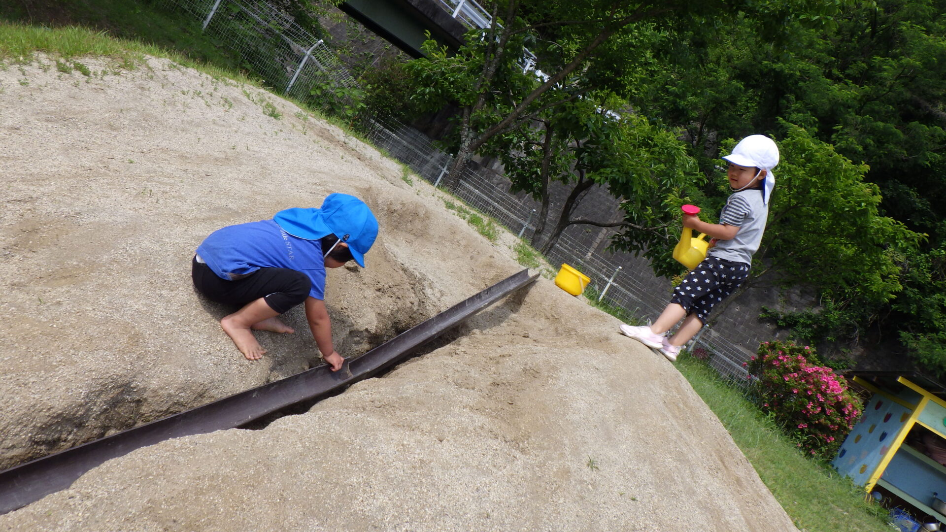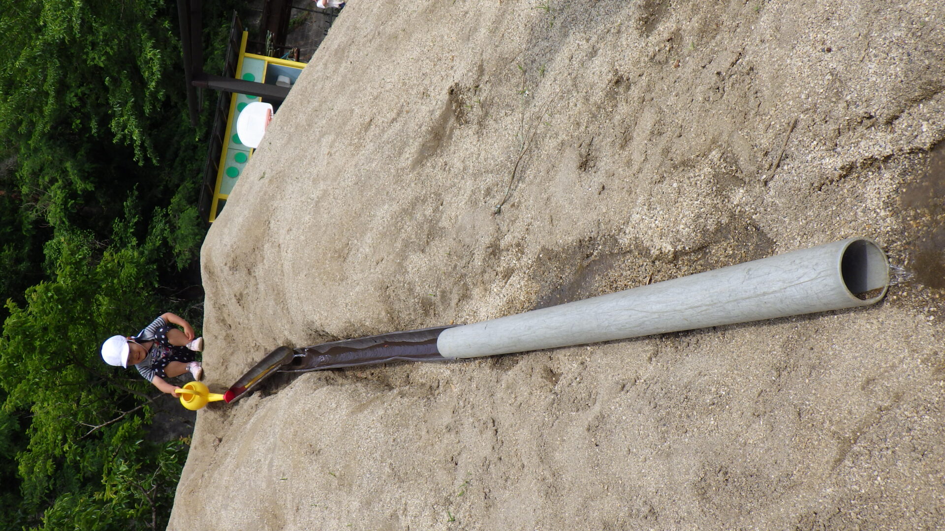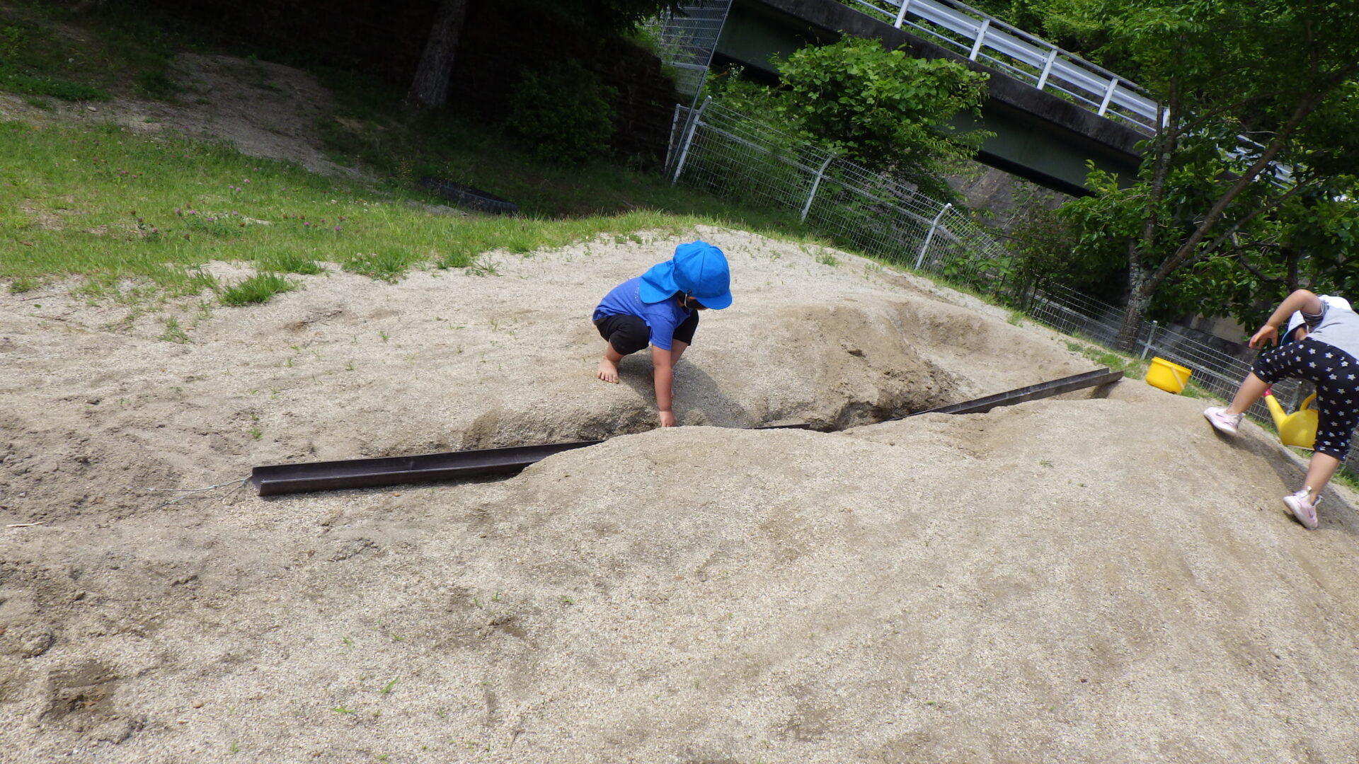 さて下流では、どんどん水が流れ、先週作った川の跡に水が流れ込み長い長い川になっていきました。堰き止めて遊んだり、水流の速さの違いや渦に気づいたり、水でドロドロになった泥で怪獣島を作ったりと、川の沿線で新たな遊びが広がりました。
