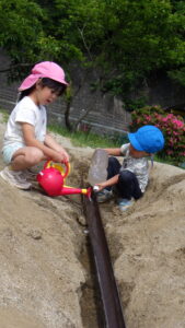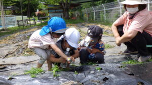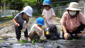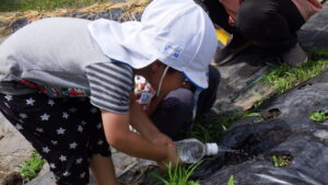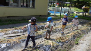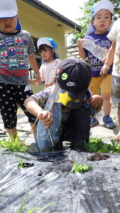 ・ミミズの発見は、初めこそおっかなびっくりの年少さんでしたが、運んでいくうちにミミズへの思いが深まったのではないかと思いました。保育士の「(芋苗に)水を~」が、この年少さん達にすると『ミミズが大変!!』と『ミミズを何とかしてあげよう!』と思ったのではないか、と感じました。