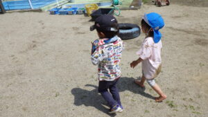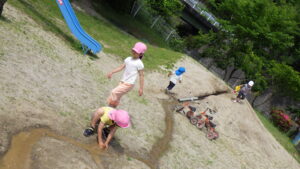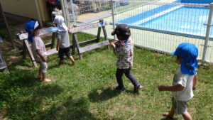 ・園庭という毎日遊ぶ環境の中で、入園して2か月の園に慣れ始めた年少さんなりにいろいろな工夫をしたり、考えたりして遊んでいる様子が感じられました。そして大きいお友だちの様子をよく見ていて学んでいることも多いと思いました。