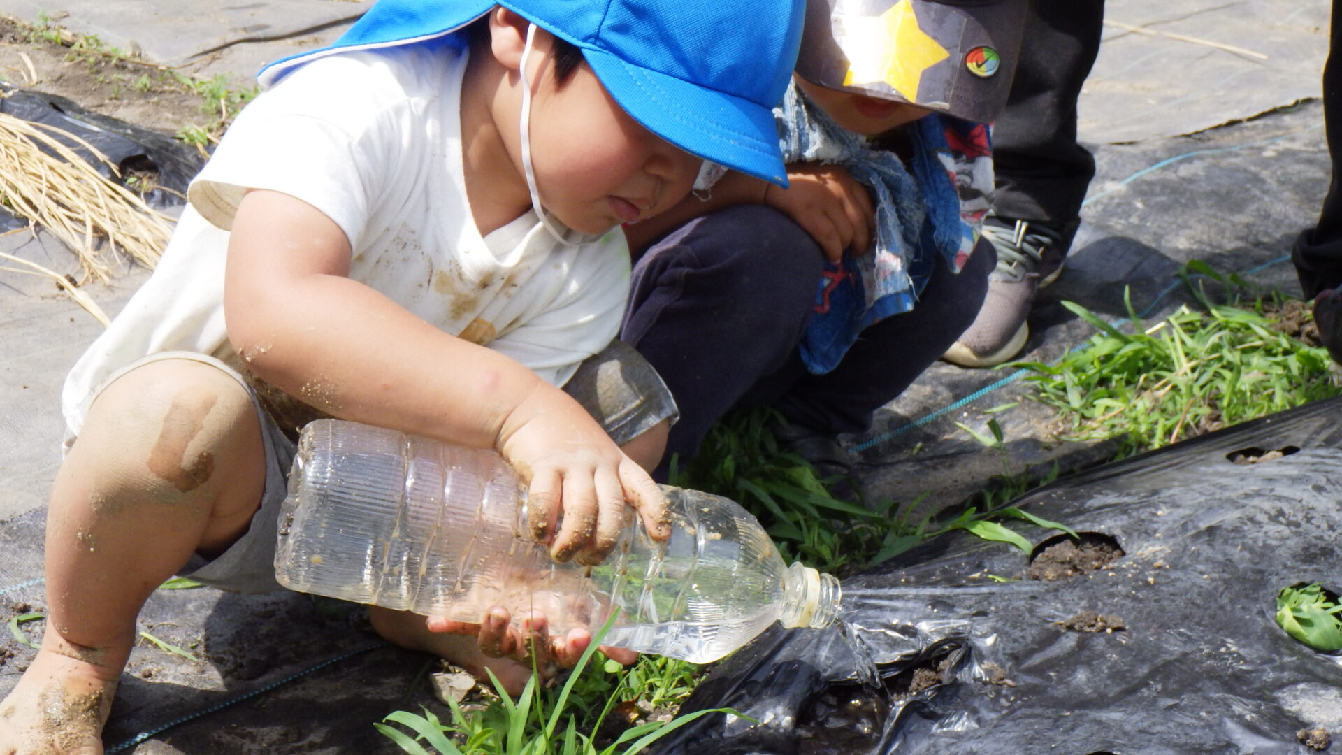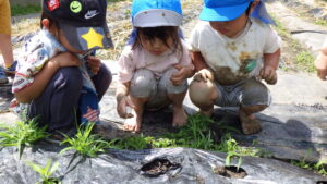 「お家に帰れてよかったね」ミミズの様子を見ていました。保育士が「畑に来たで、ついでに芋に水やってくか。喉乾いとるかもしれんで」と声をかけました。