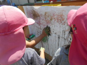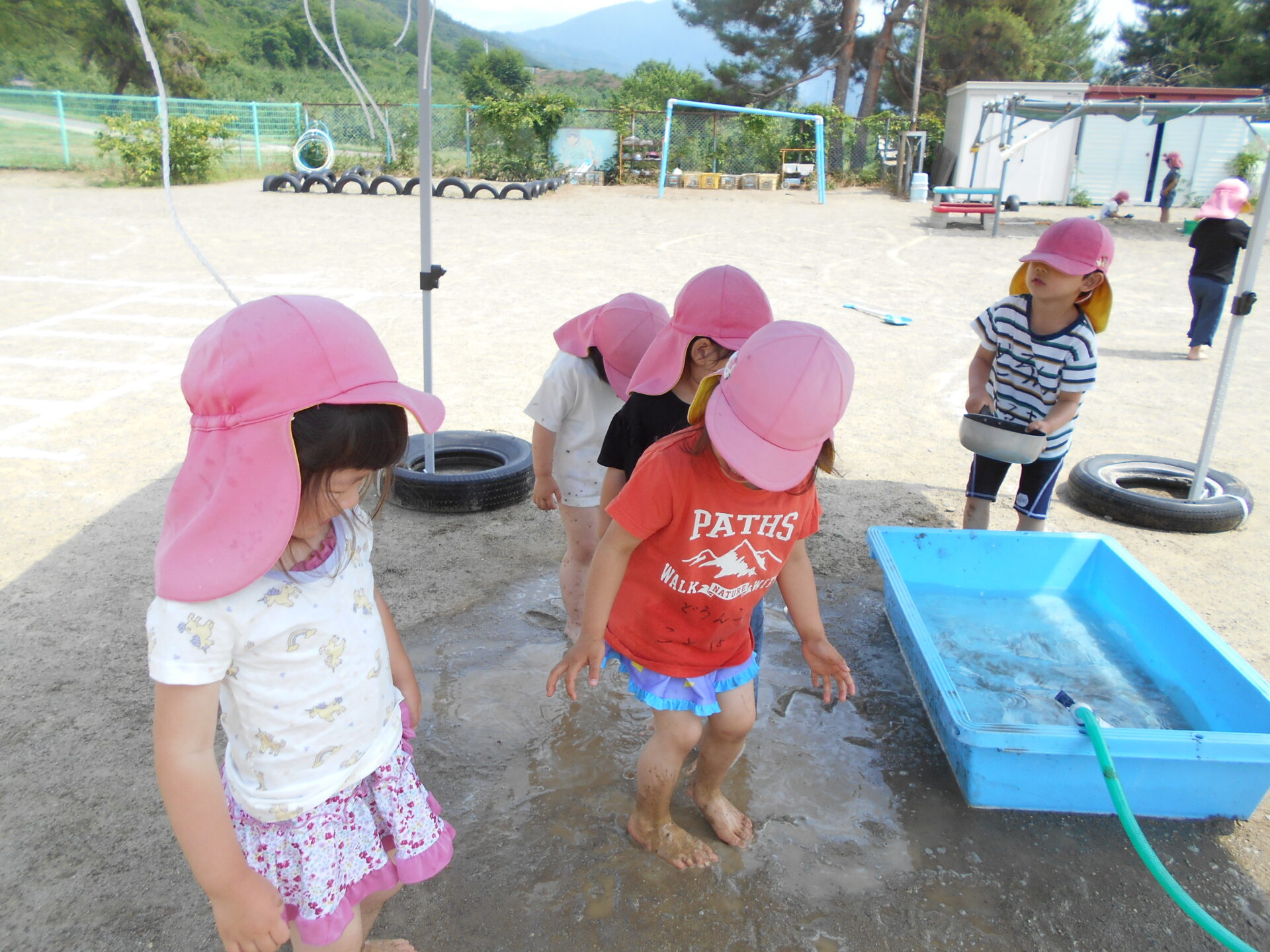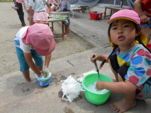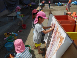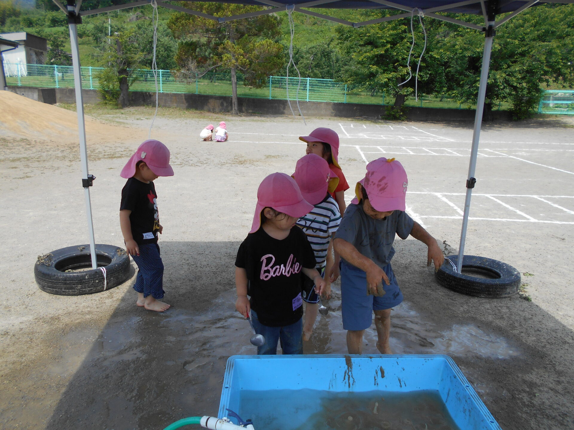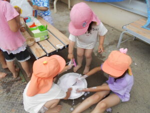 最初は泥に抵抗があった子も年上児や保育士が楽しそうに遊んでいる様子を見て「やってみたい!」という思いが出てきました。