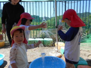 ペットボトルシャワーから落ちる水を、手や足に掛けていました。