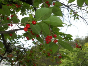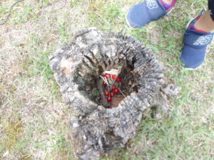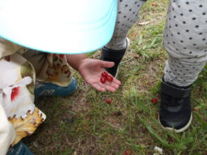 「たくさん落ちてる!!」とさくらんぼの実を拾ってあそびはじめた子どもたち。