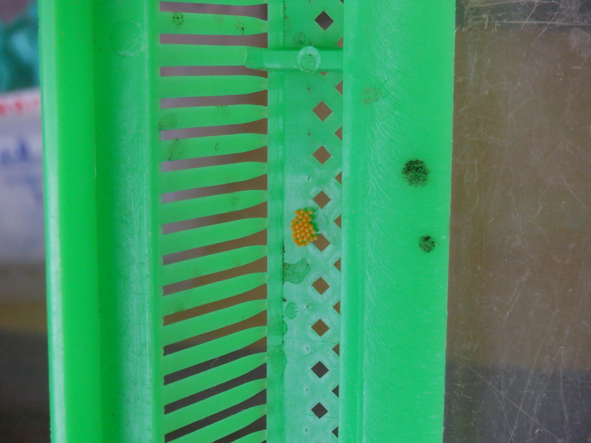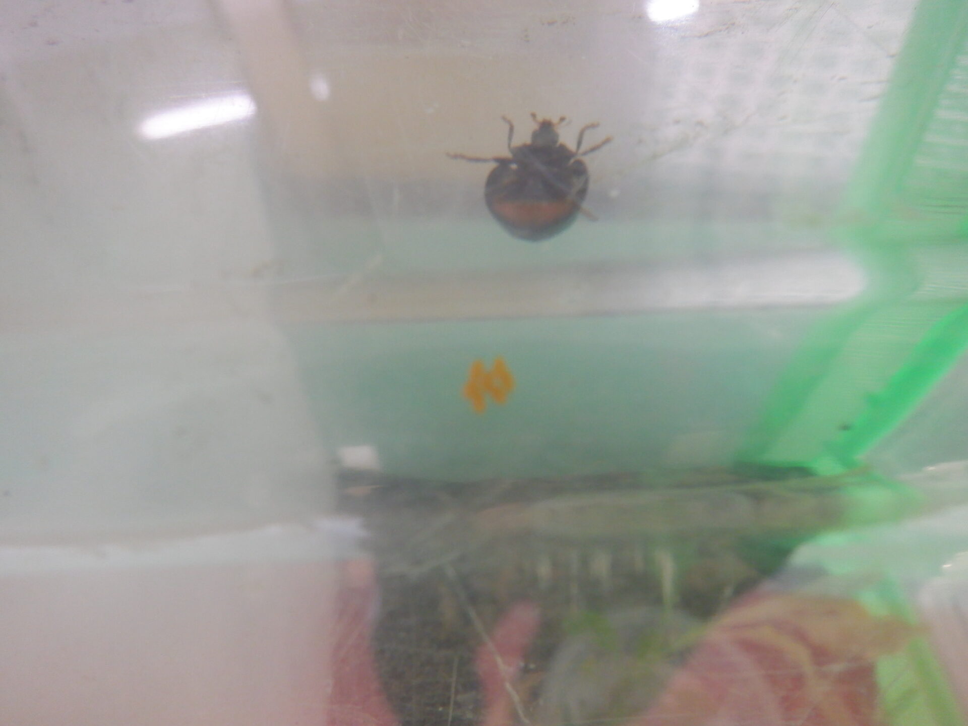 飼育ケースに環境を整えて観察することで、テントウ虫が卵を産んでいることを発見!!