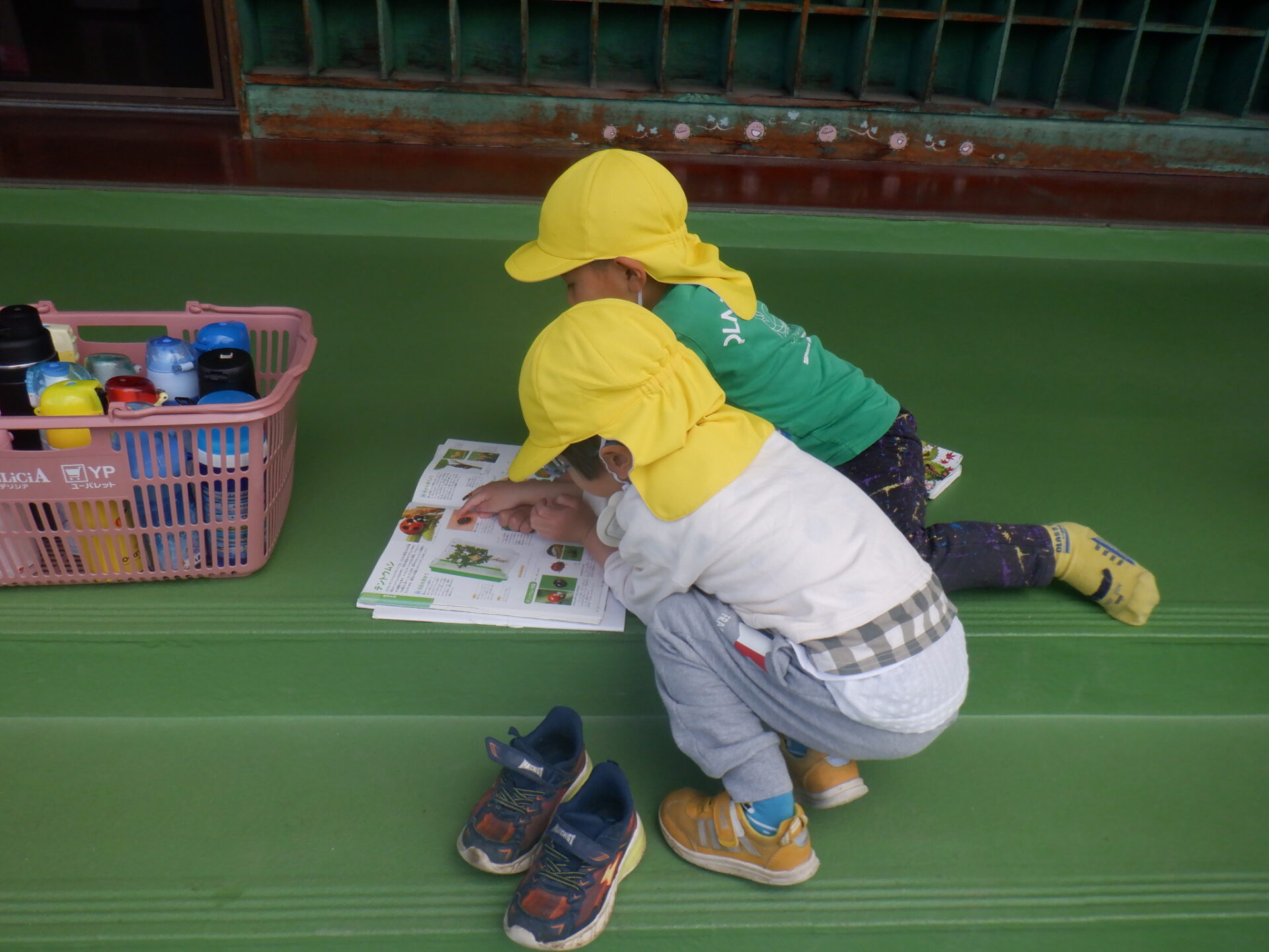 捕まえたテントウ虫と、図鑑とを見比べながら、友達どうしで会話がはずみます。