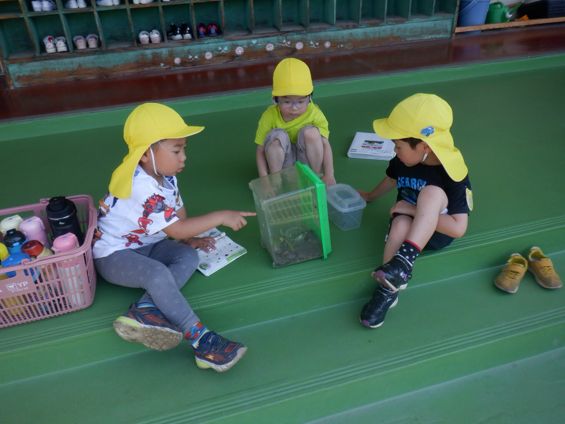 図鑑を友達と一緒に見ながら必要なものを調べることで、アブラ虫のついた草を探してきて世話をする姿がありました。