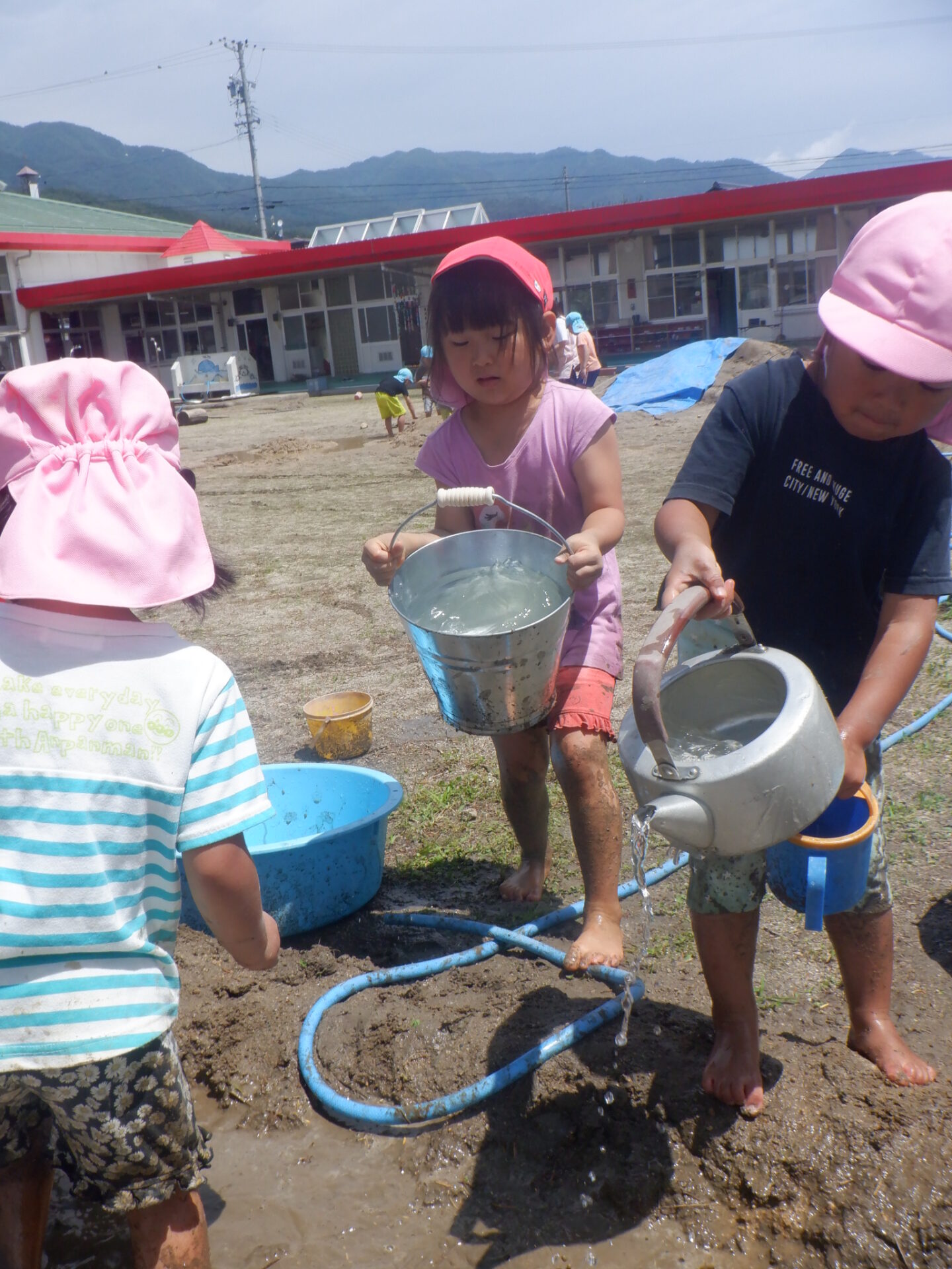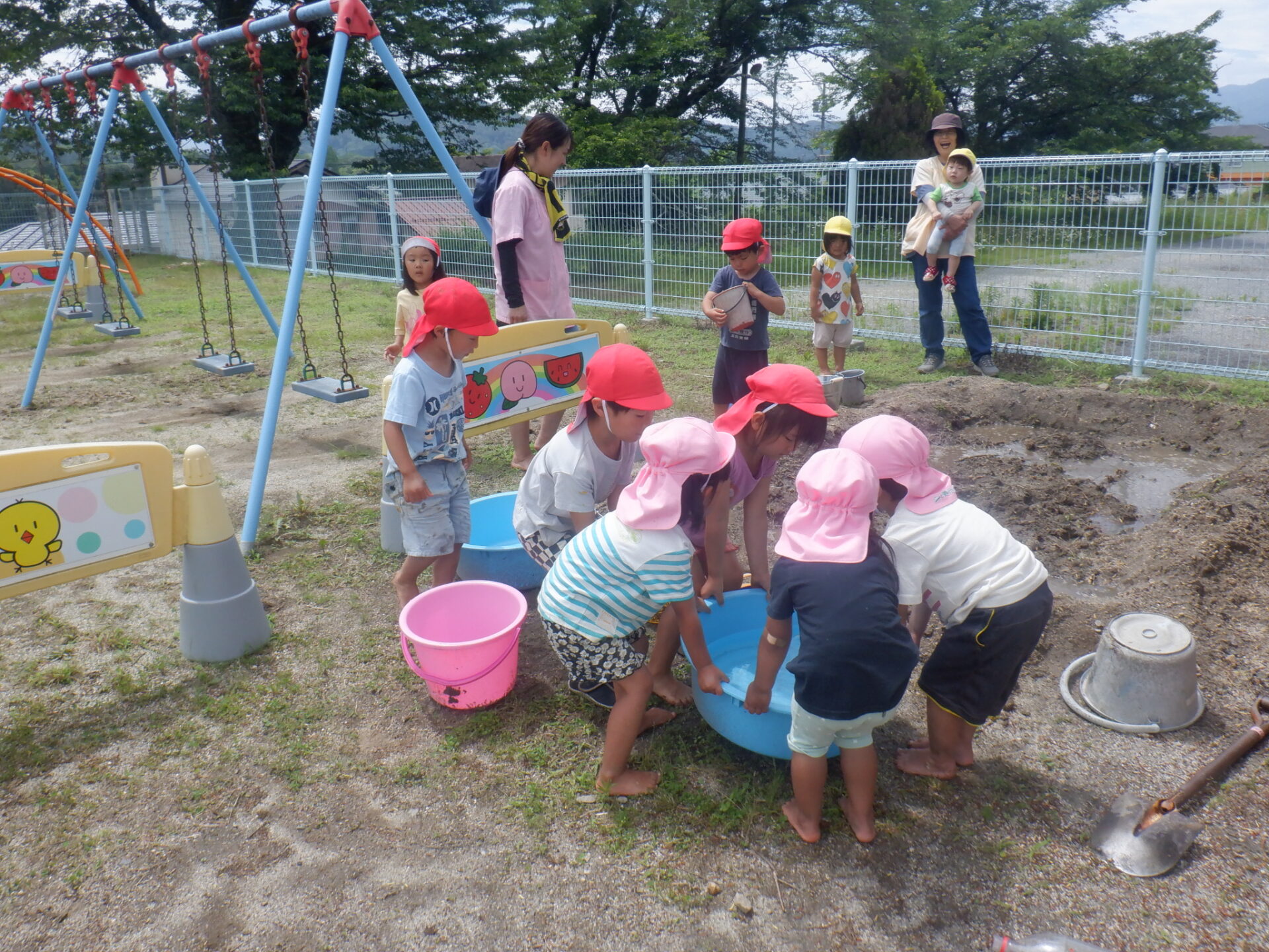 ・お水がいっぱい入ったタライ、重たくて持てない皆手伝って・・・