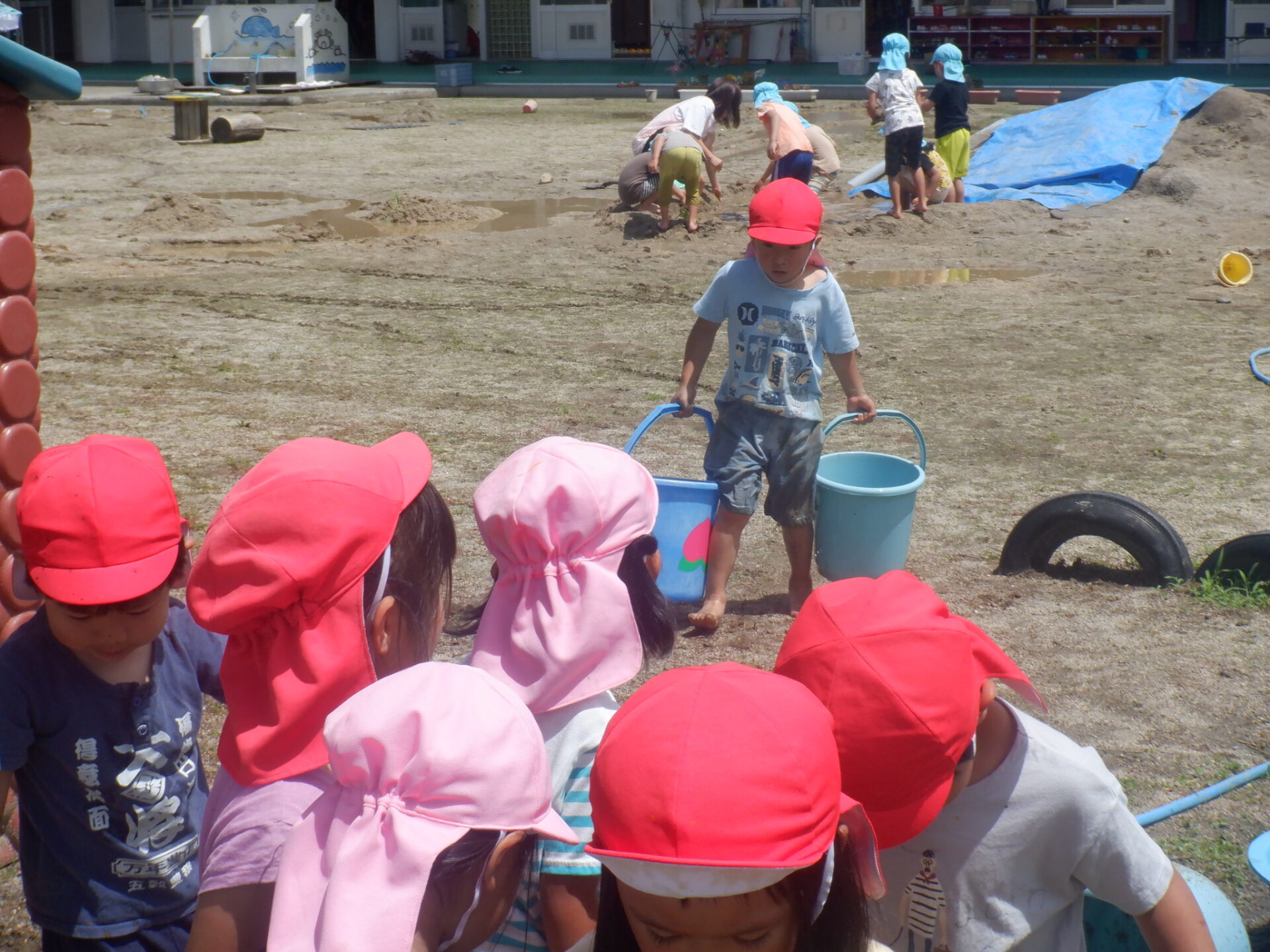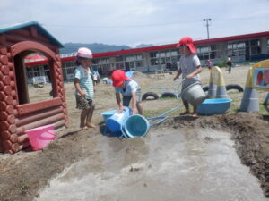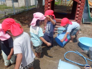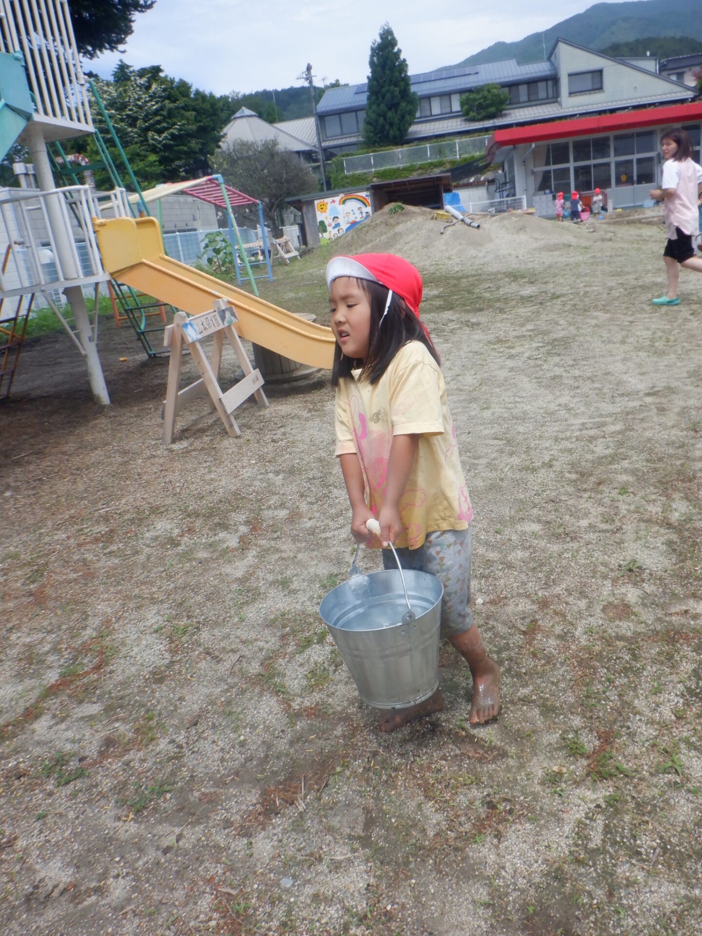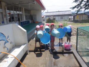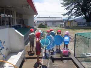 年中さんも年少さんも力を合わせて、大きなタライを運びます。雨水を溜めておいたバケツやタライも満タンになっていてどんどん入れていきます。