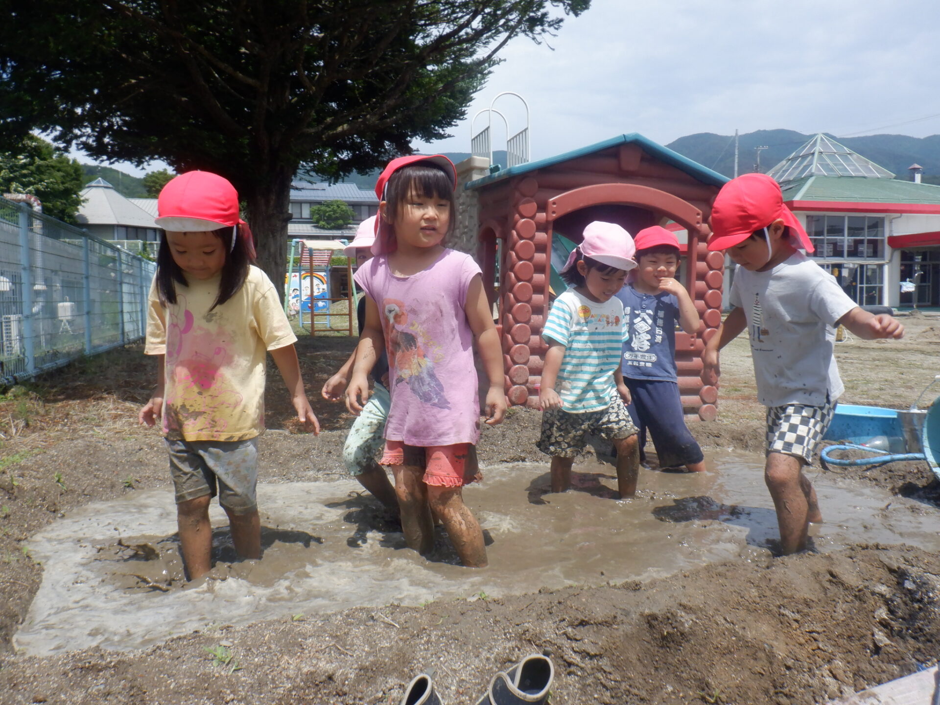 年中さんが真似してペタペタやってみます。田んぼってこうやって作っていくんですね。