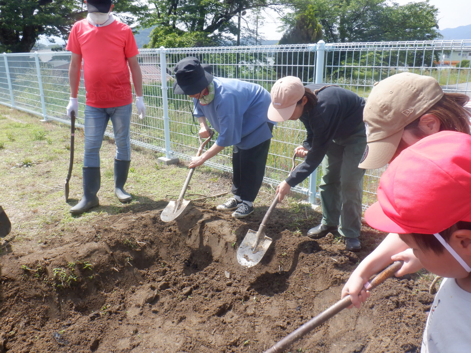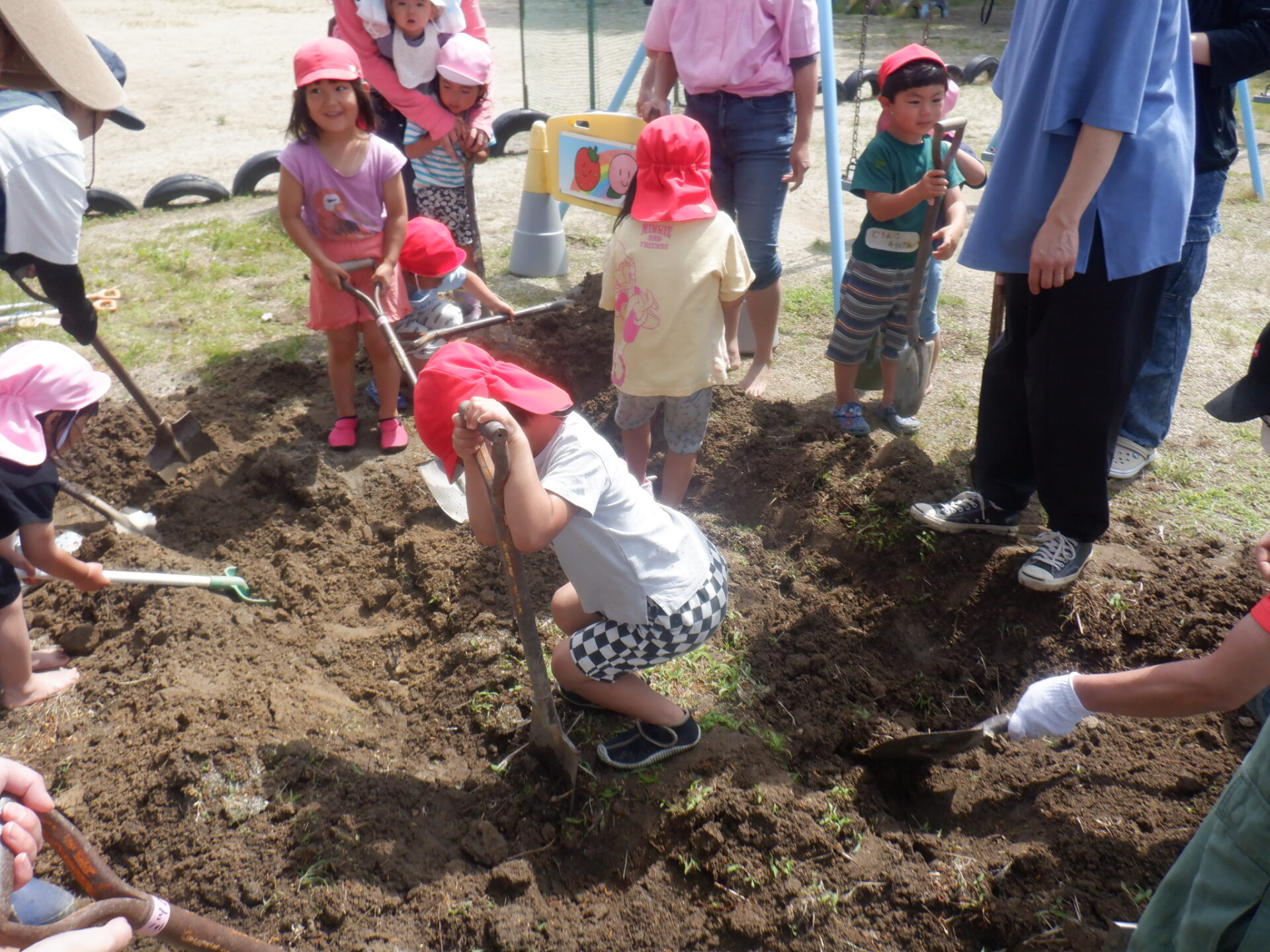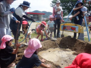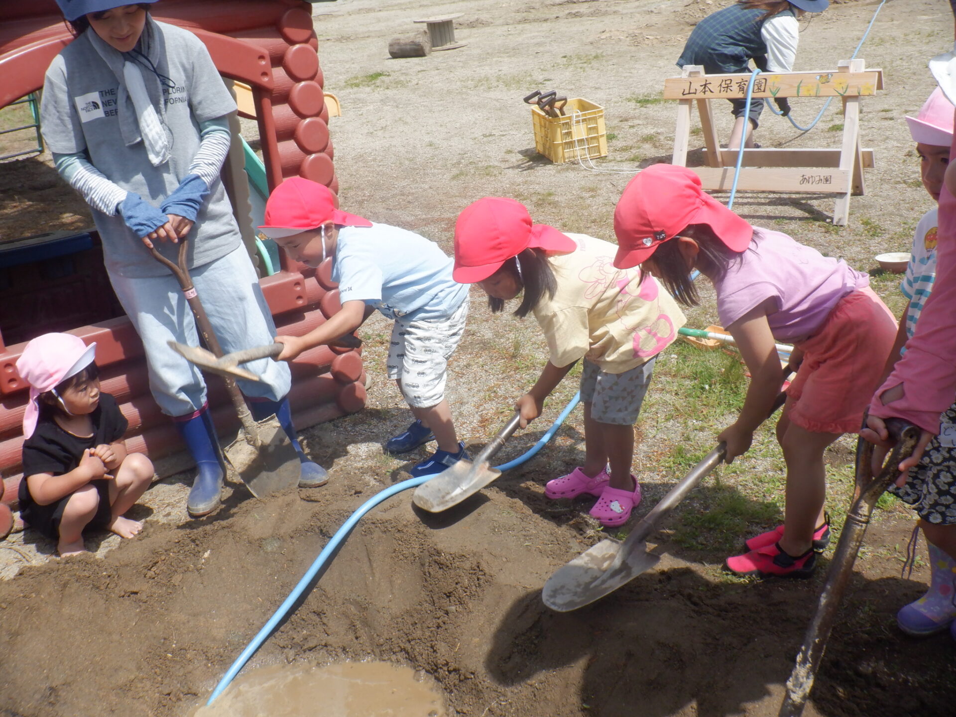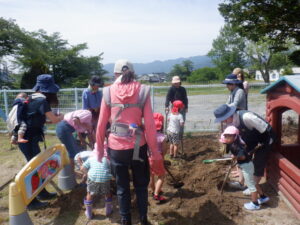 園庭の端に田んぼを作ろうと穴を掘り始めましたが、なかなか硬くてこどもや職員の手だけでは進みません。参観日におうちの皆さんに応援してもらうことにしました。