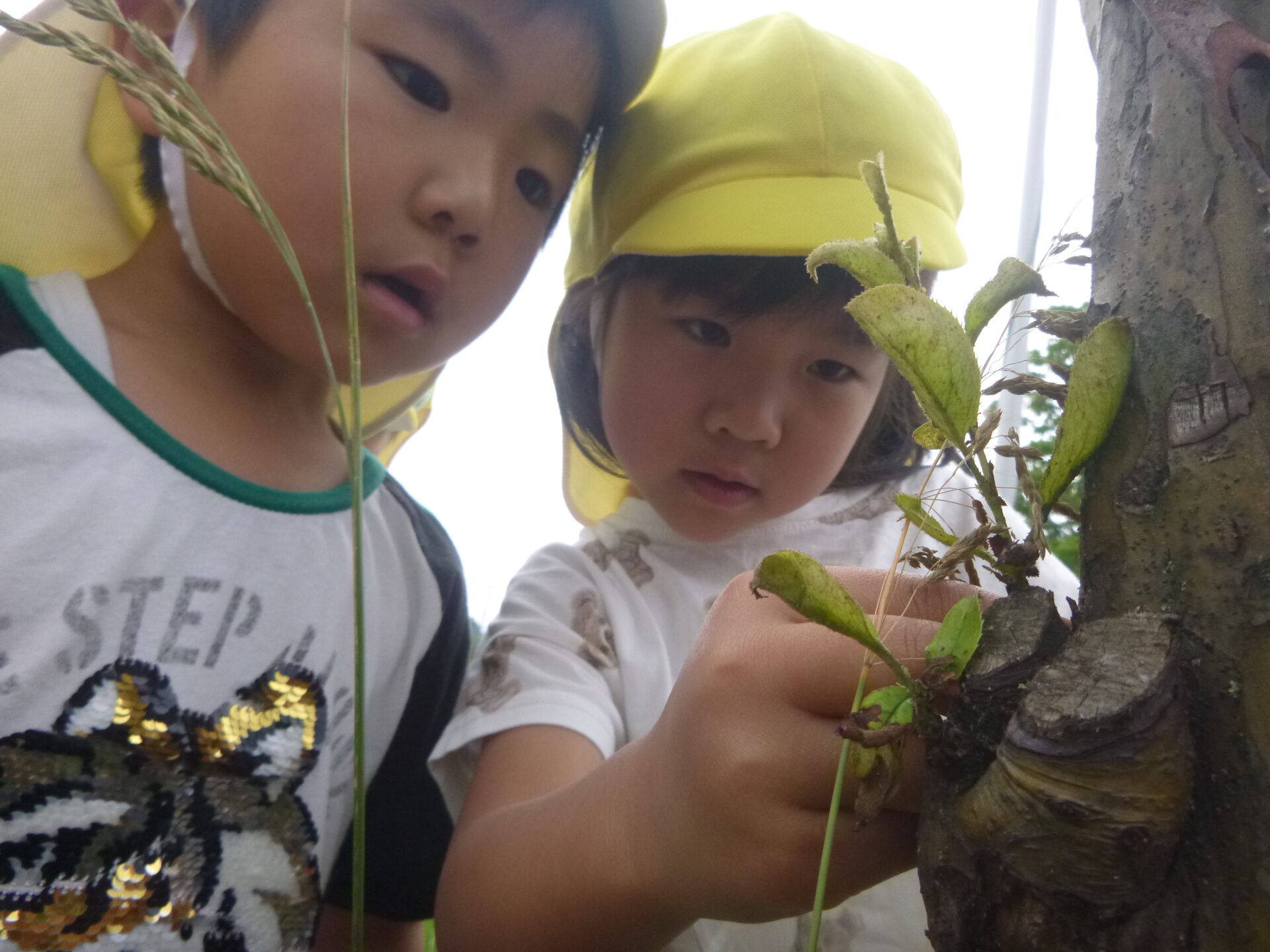「くすぐったいよ〜」とテントウムシ探しに夢中になる子どもたち。