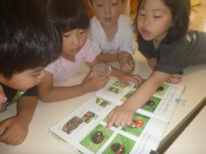 「テントウムシの絵本を見ればいいんじゃない?」と絵本を探し、みんなで見ました。