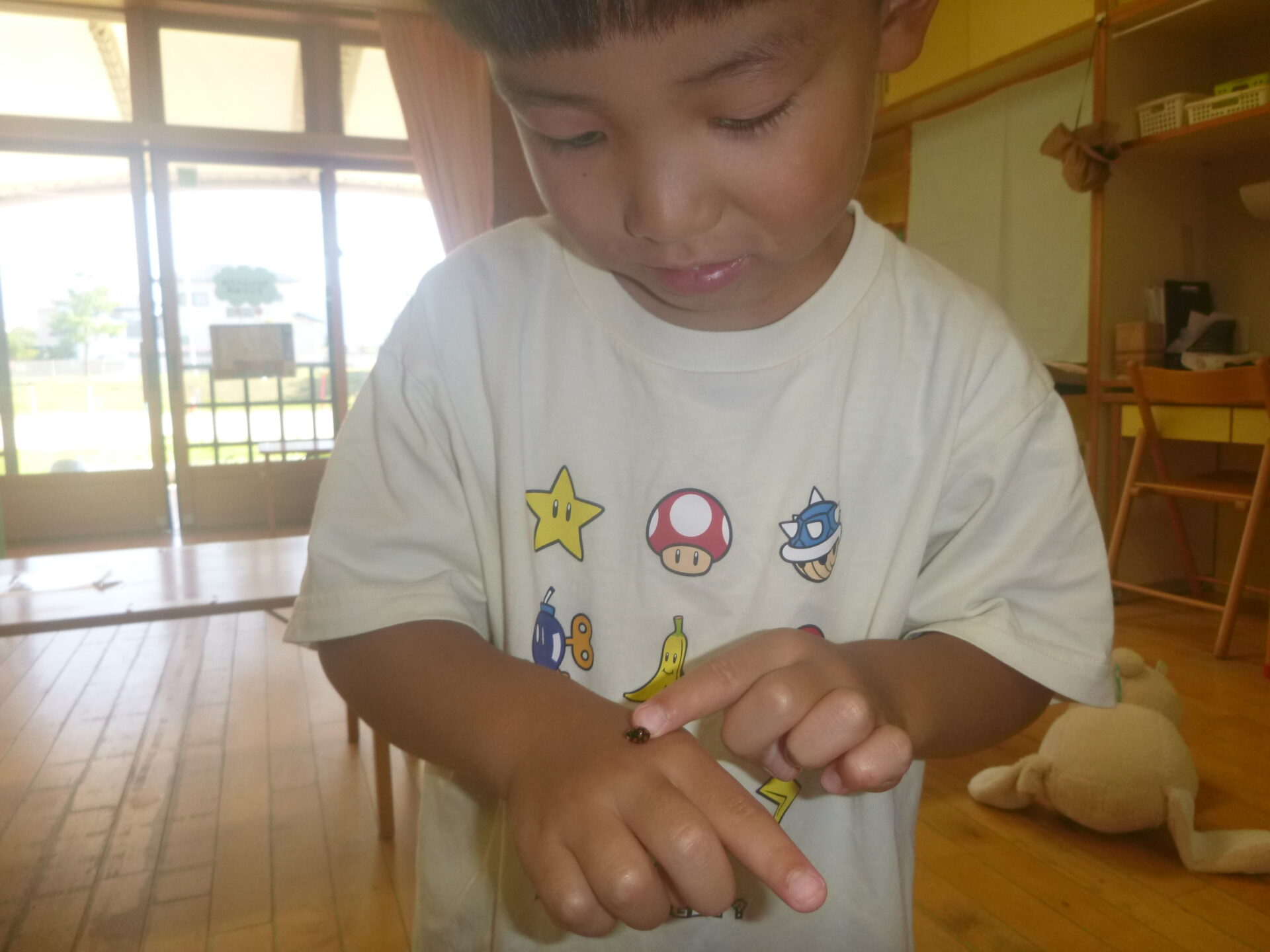 帰りの時間も「かわいい〜」とテントウムシと一緒に遊ぶ子どもたちでした。