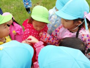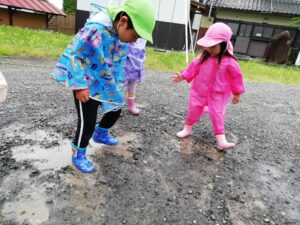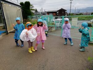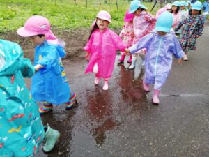 今年度、はじめて雨降り散歩で、いつもの散歩道でも違う景色があり、自然と会話が広がっていた。水たまりにダイナミックに入ったり、雨の中でも戸外で過ごしたりして雨の日ならではの発見をして楽しんでほしい。