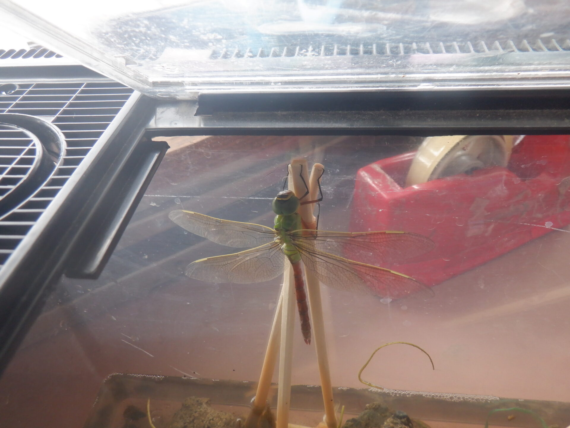 飼育箱の蓋を開けると最初はジッとしていたとんぼですが、急に飛び立ったと思ったら、Tさんの首にくっつき、ゆっくりよじ登っていました。「痛い。」と声を発したら、屋根の上の方へ飛び立ち、皆で元気に巣立つとんぼを見送りました。