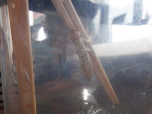 そして、翌朝よく見ると、昨日入れた割り箸にヤゴがくっついていました。