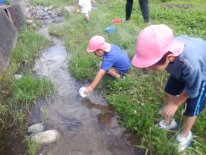 問題の餌は「アカムシだよ。」と家から聞いてきて話してくれる子もいましたが、それはなかなか手に入りにくいので、悩んでいると「オタマジャクシを食べるってお父さんが言ってたよ。」という声が上がり、じゃあオタマジャクシを捕りに行こうと近くの田んぼへ向かいました。