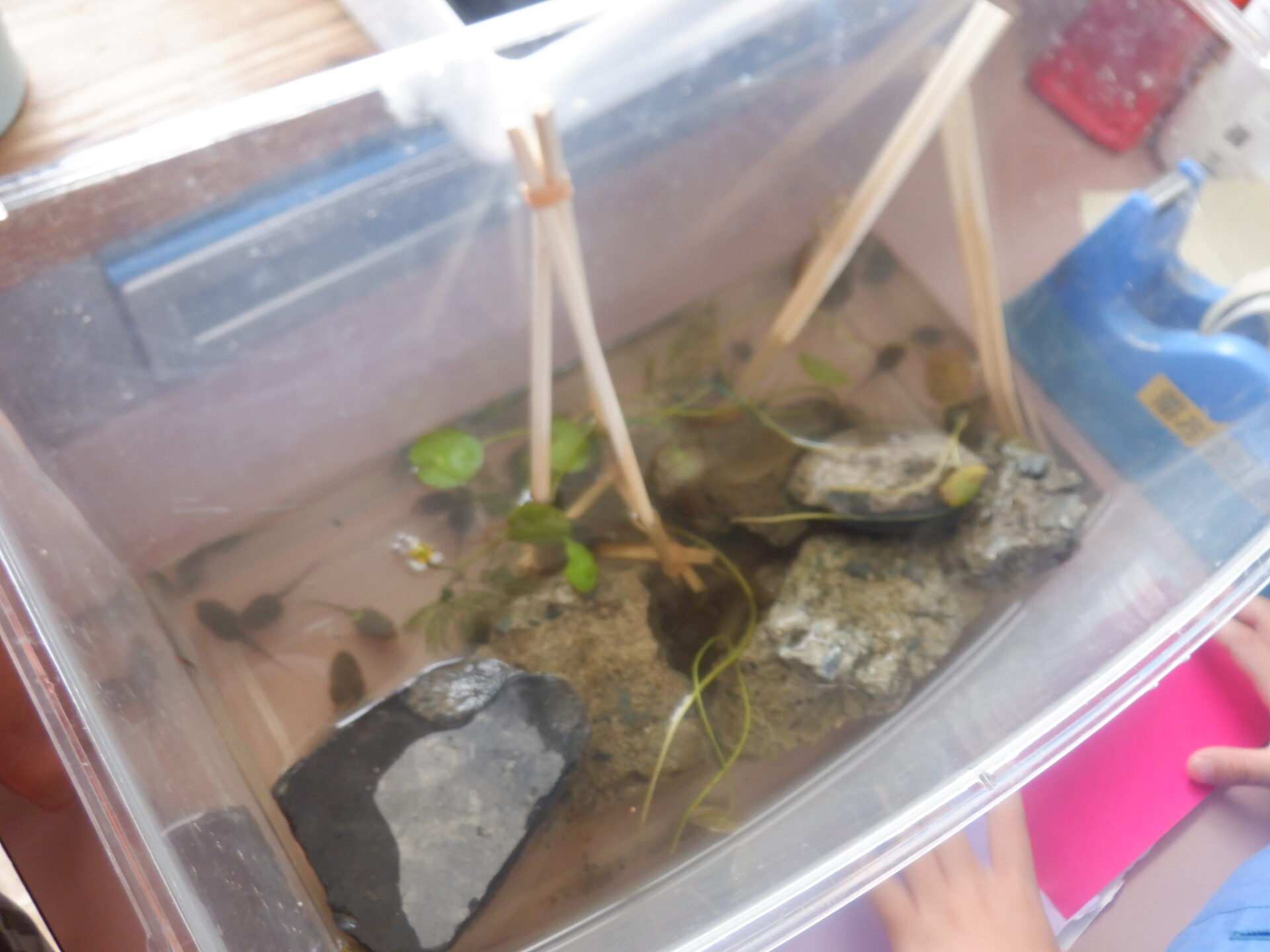 まだヤゴは何匹もいて、オタマジャクシを食べています。次はどれがとんぼになるかな?おたまじゃくしは生き残れるかね?とこども達は興味津々です。
