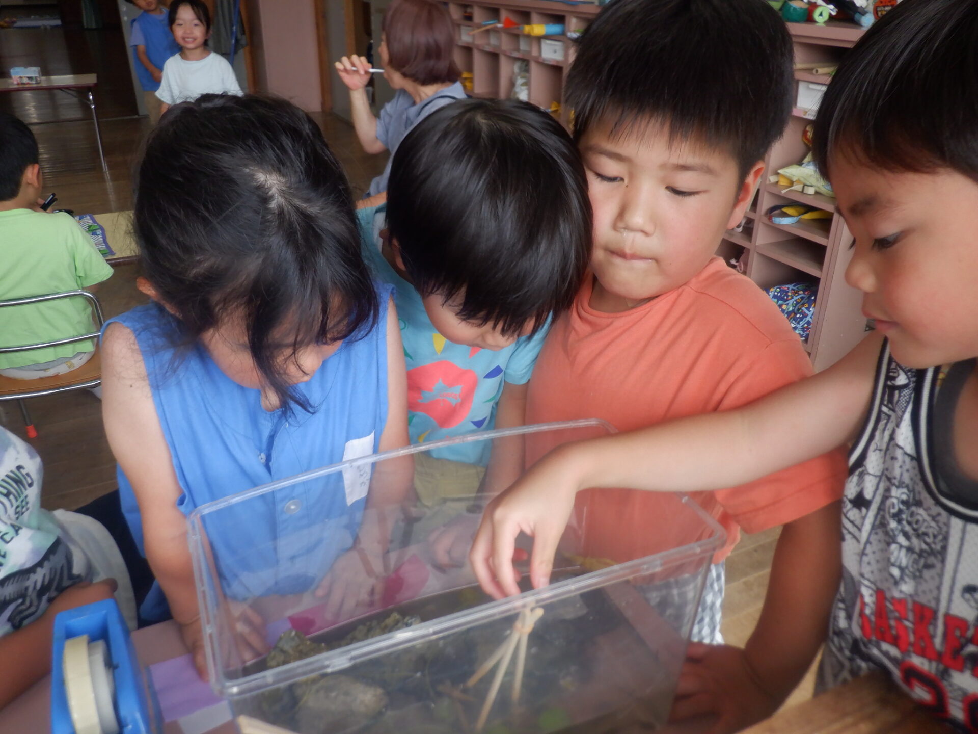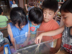 飼育の仕方を図鑑やインターネットで調べたり、おうちの人に聞いたりして、昨年(年中)は死なせてしまったヤゴを今年こそとんぼにしたいというこども達の思いが感じられた。飼育箱に割り箸でつかまる場所を作りヤゴがつかまる姿をみたり、小石を敷いたことでヤゴが隠れている様子を見ることができたりしたことは生き物を飼育するためには必要なことがいろいろあることが分かったのではないかと思う。