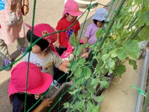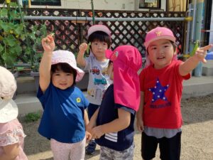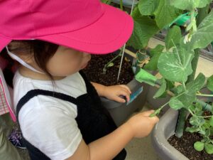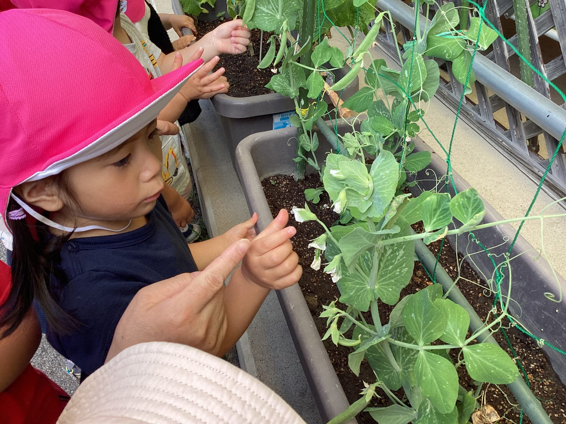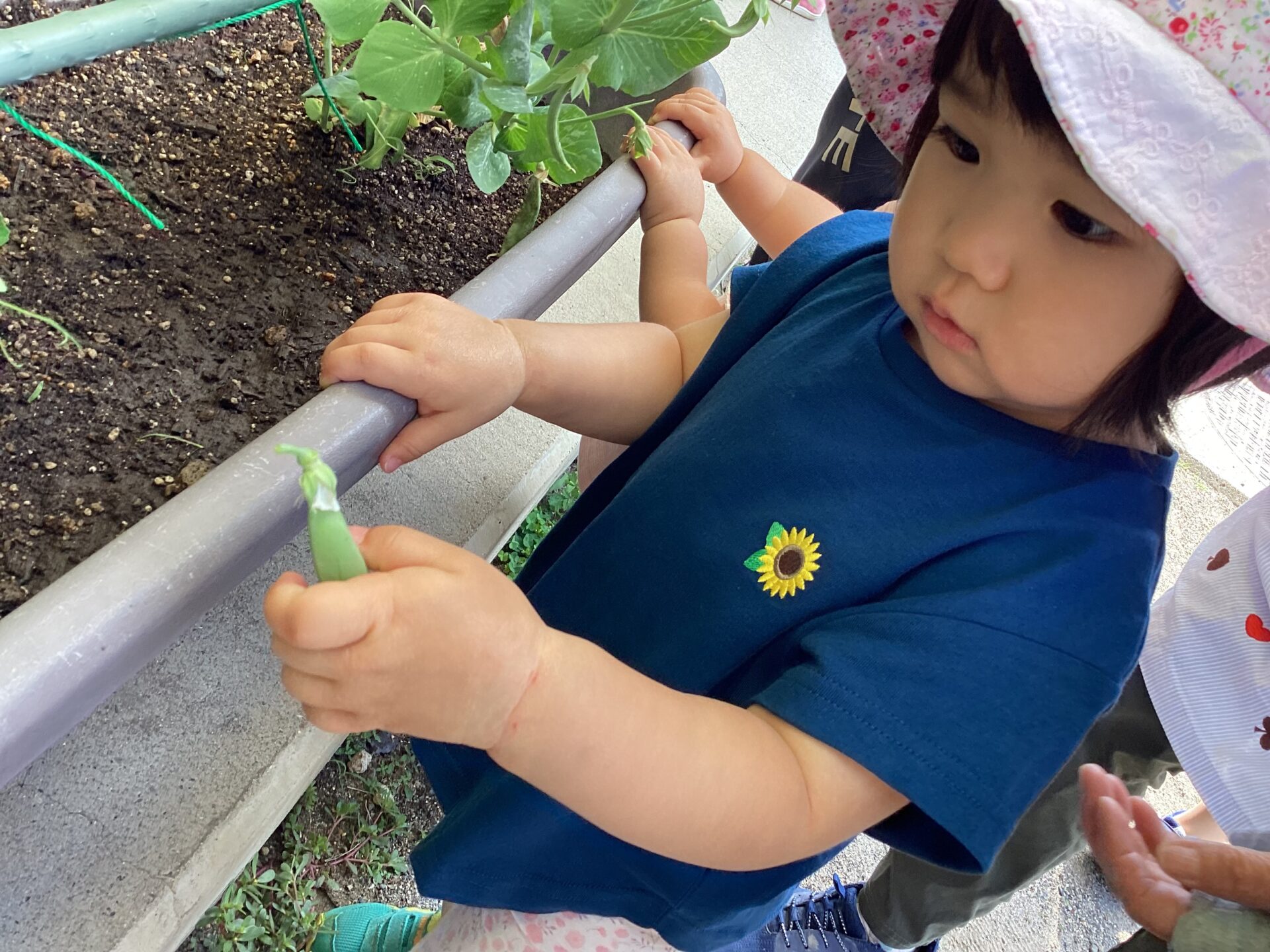 ・キュウリが給食にでてくると、『このキュウリ、ひよこ組でとったキュウリ・・?』と聞いてきたり、ちょっとだけかじって食べたりと自分の収穫したものは特別な存在になっているので、スナップエンドウも楽しみをもって食べてほしいな。