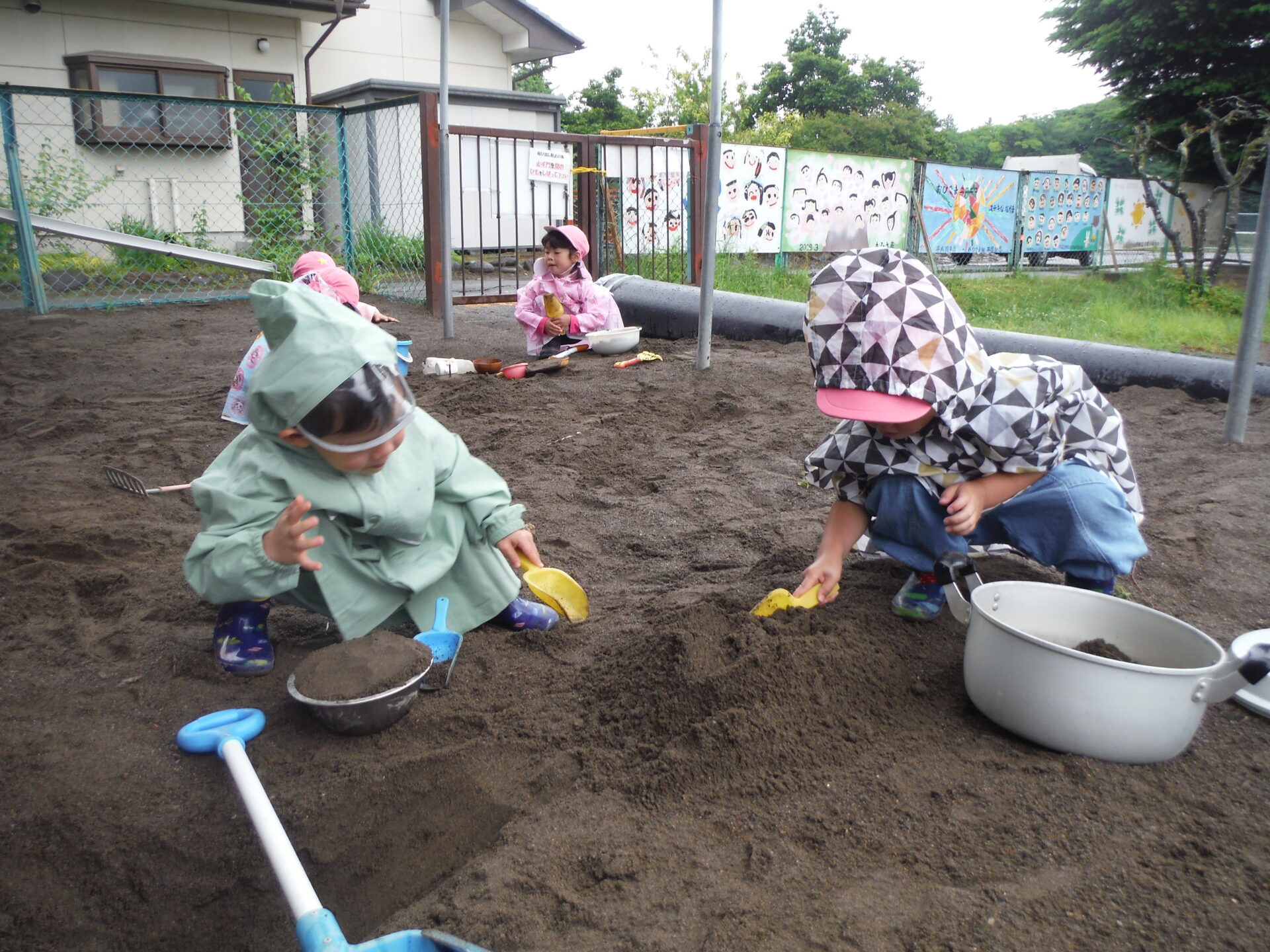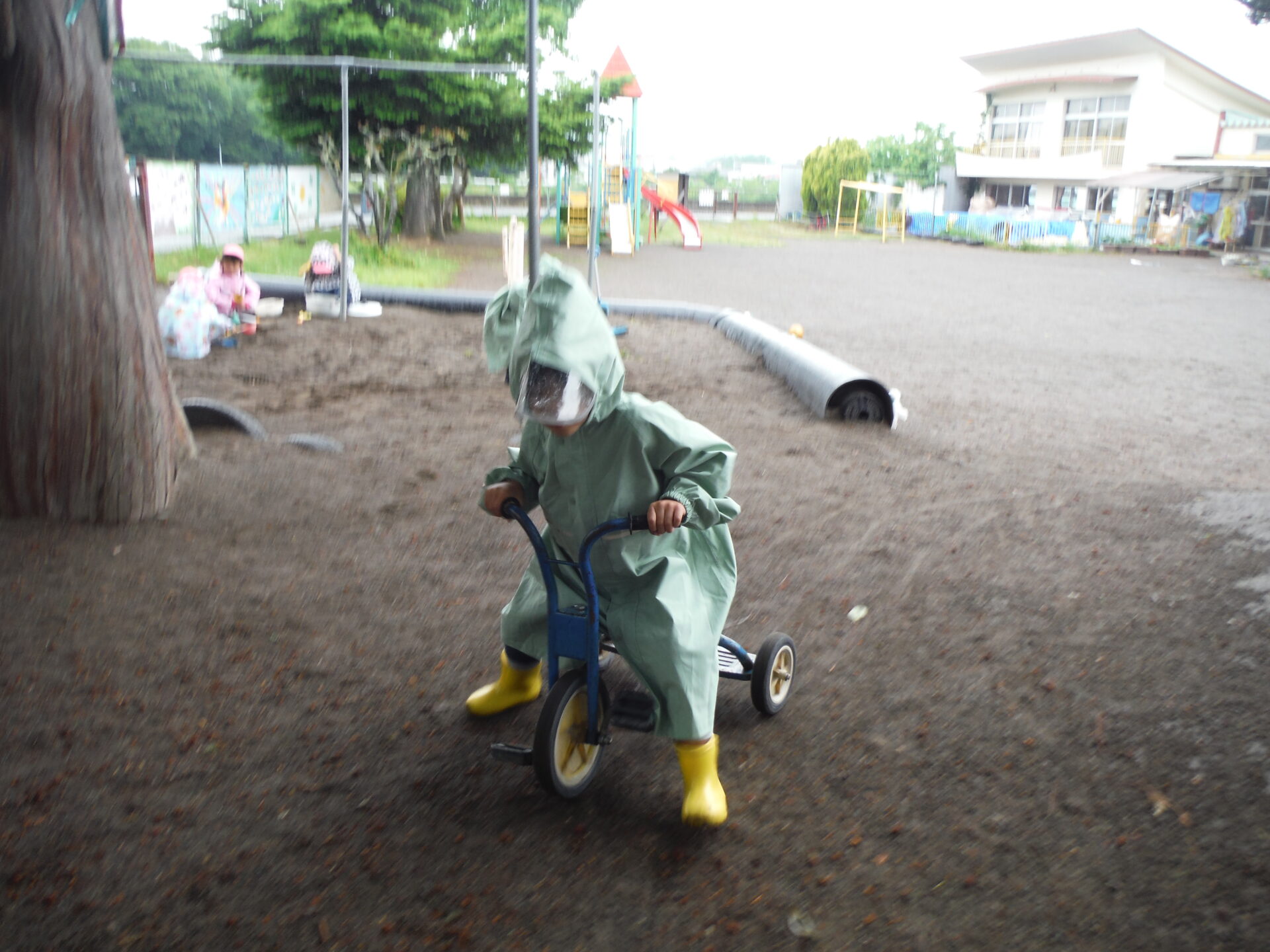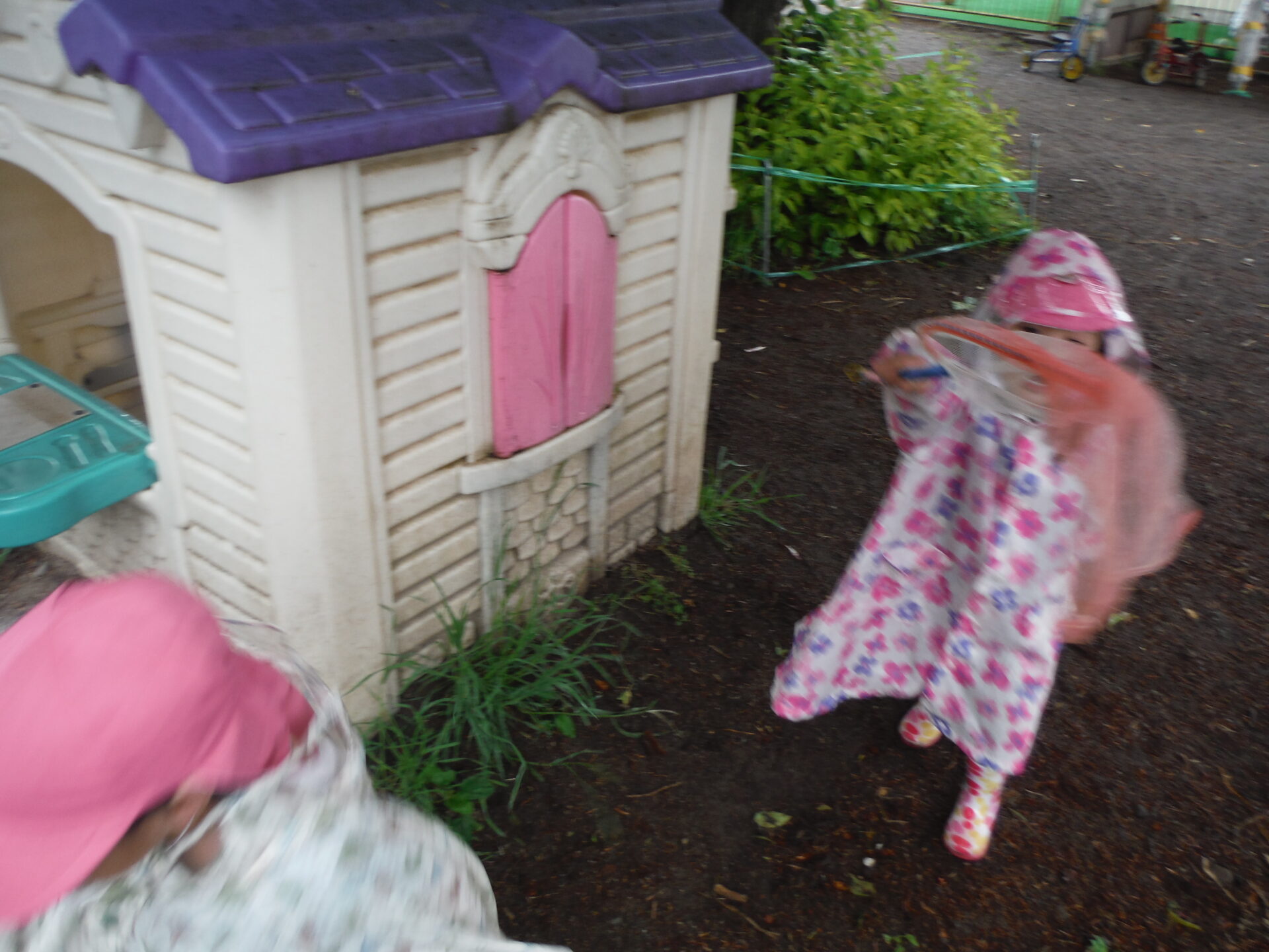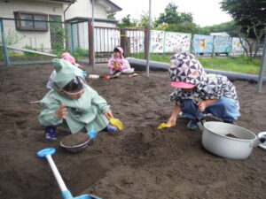 そして、園庭でカッパを着たまま、雨の中の遊び✨を開始です。