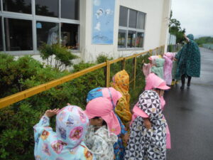 カッパに当たる雨の音やいつもみている景色と少し違う雨の景色を見たり、雨のにおいを感じたり・・・しながら園に戻ってきました☺