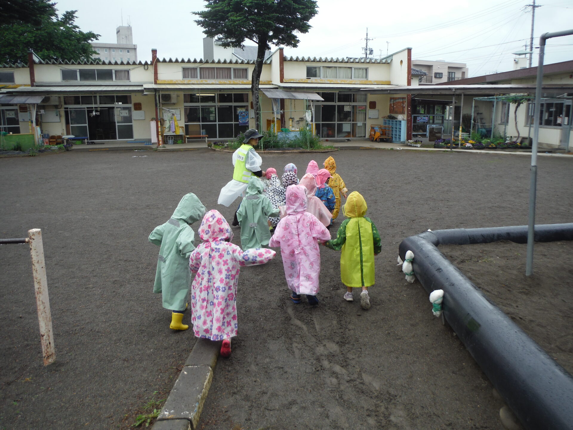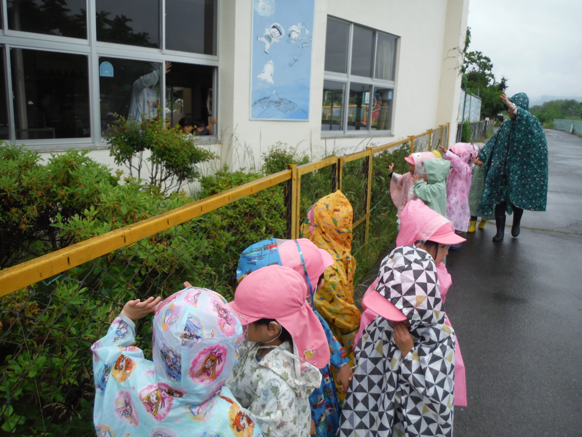 強めの雨だったので、園の周囲を一周お散歩。