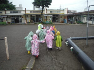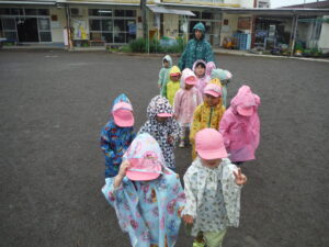 子ども達と雨が降る梅雨の時期に「カッパを着てお散歩に行くこともできるけど、行ってみる?」と話していました。「え?雨のお散歩?行きたい!」「行ってみたい!」と楽しみにしていました。雨が降るたびに「お散歩行く?」とワクワクする子ども達。