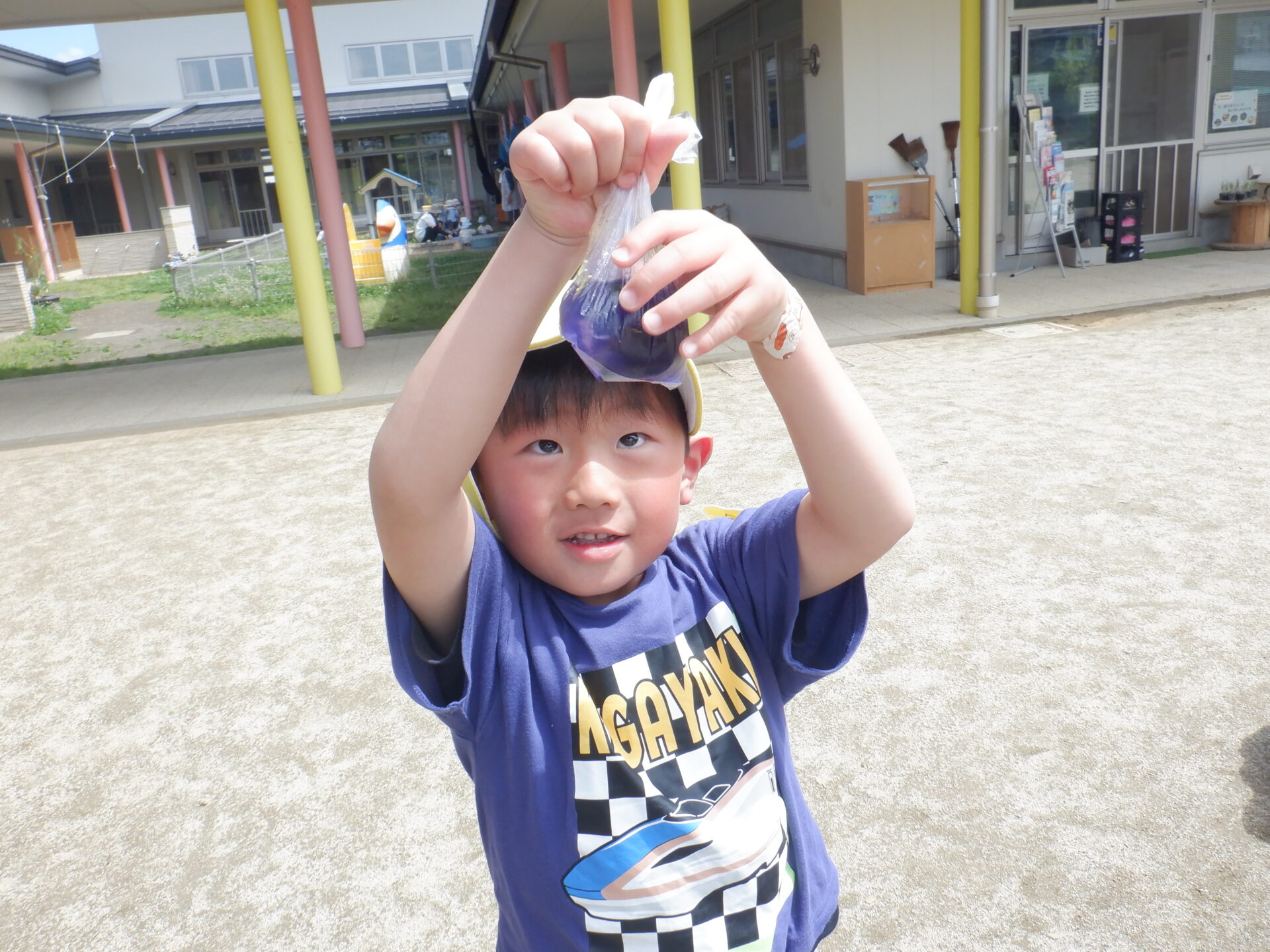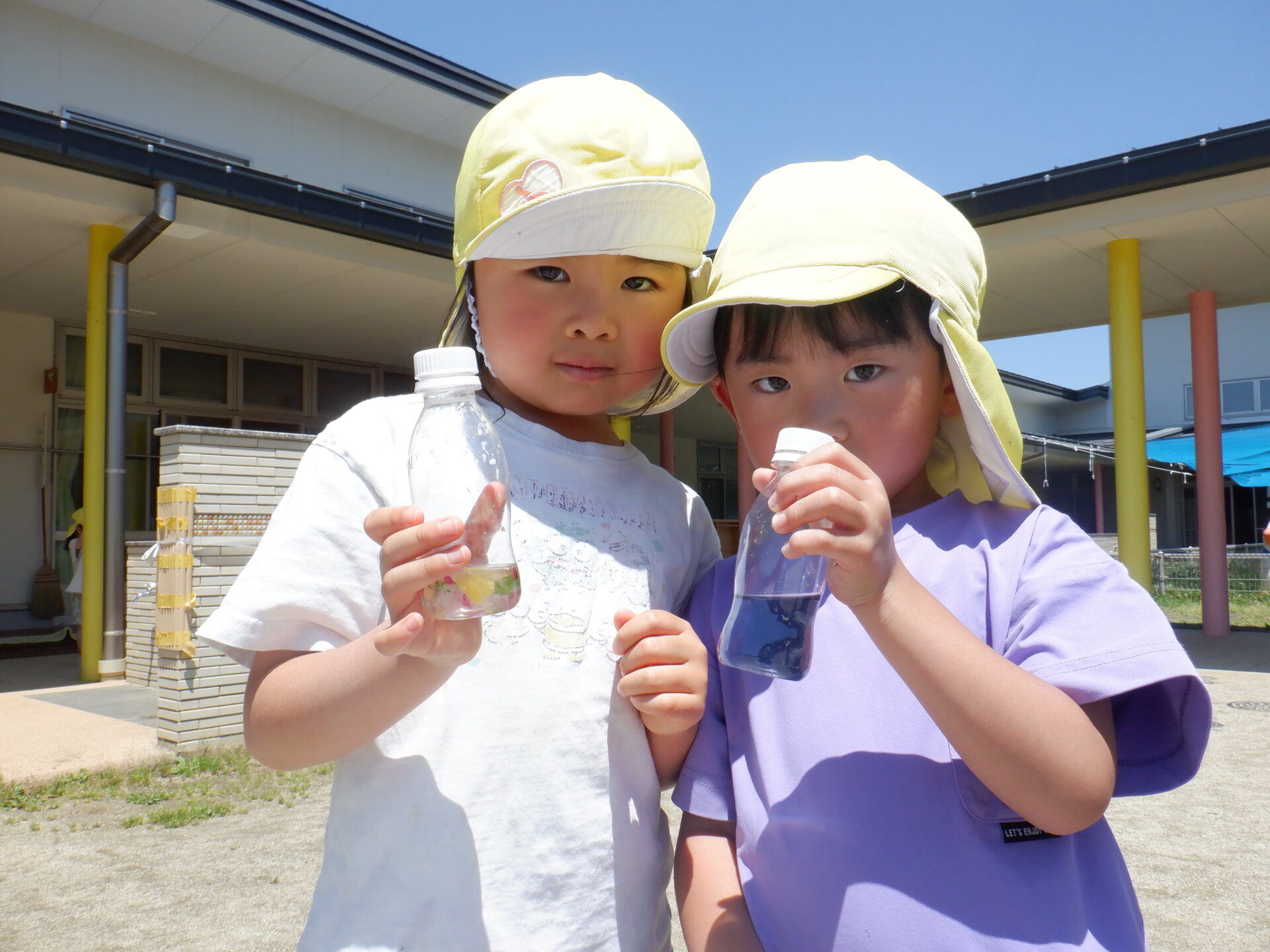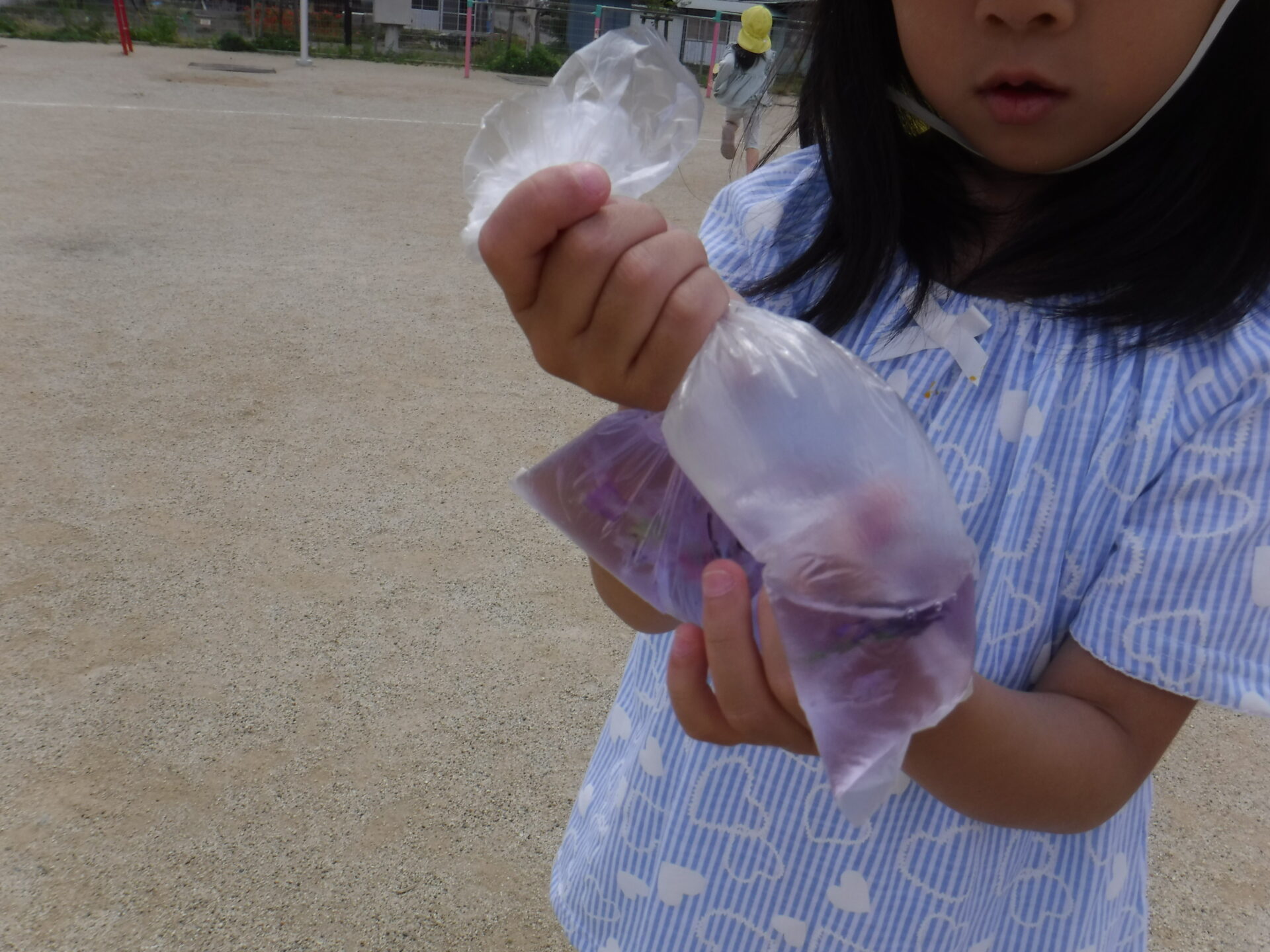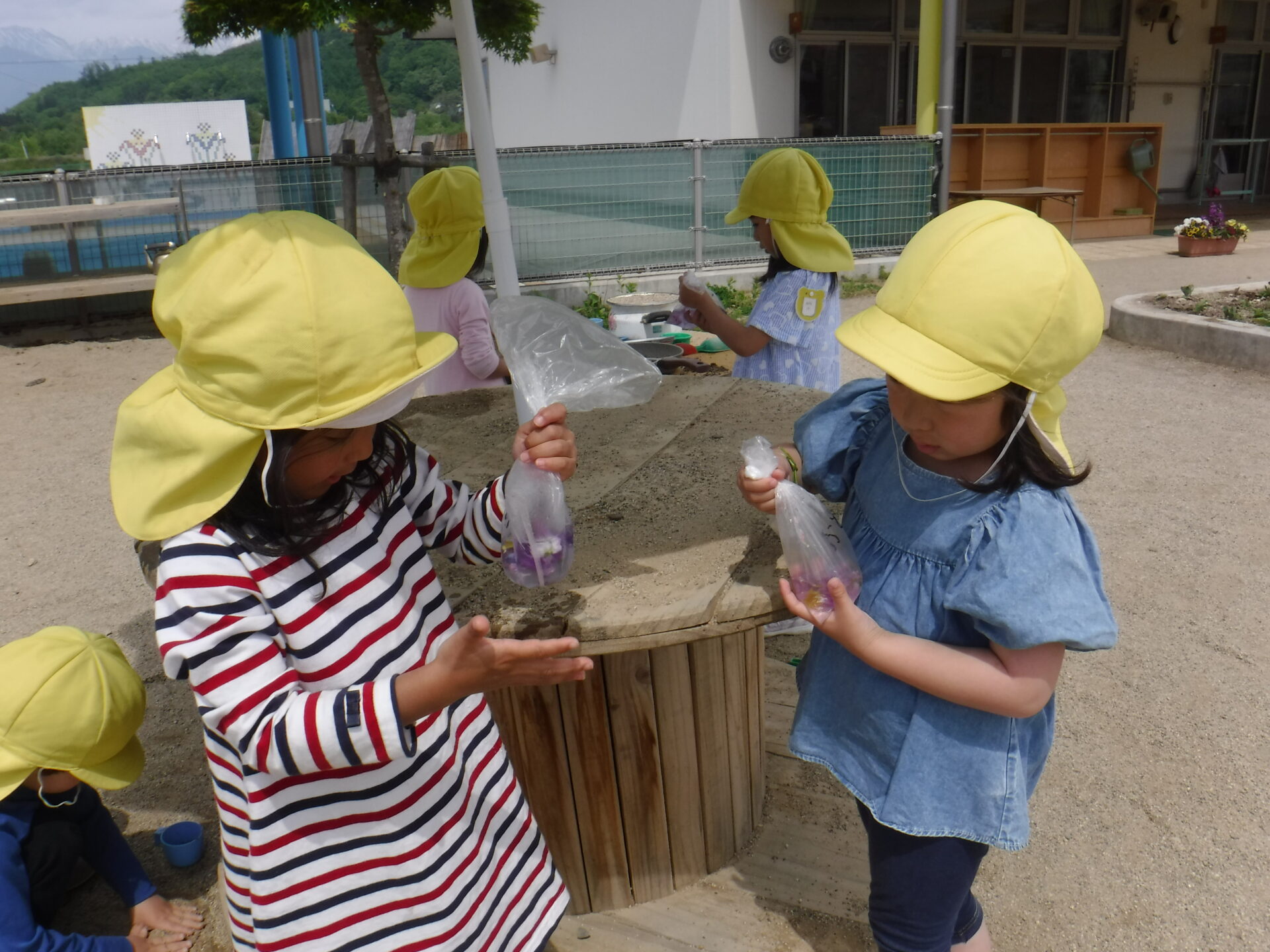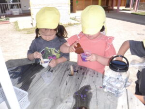 園庭に咲いている草花を見たり集めたりして楽しむだけでなく、水に浮かべ楽しむ中で水に色がつく不思議さに気づくことができた。花によって色が違ったり、どうやったら色が出るのか考えたりすることを通して、友達とのかかわりが増えてきています。