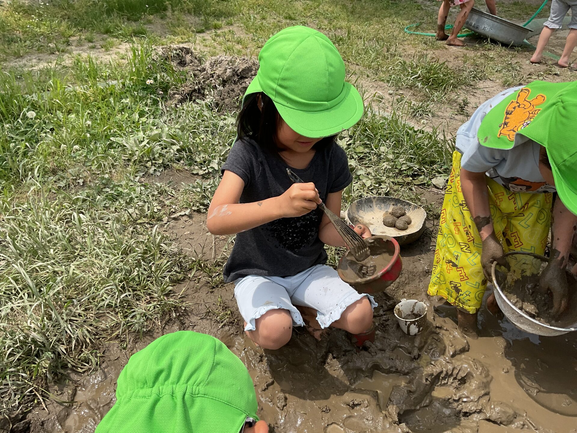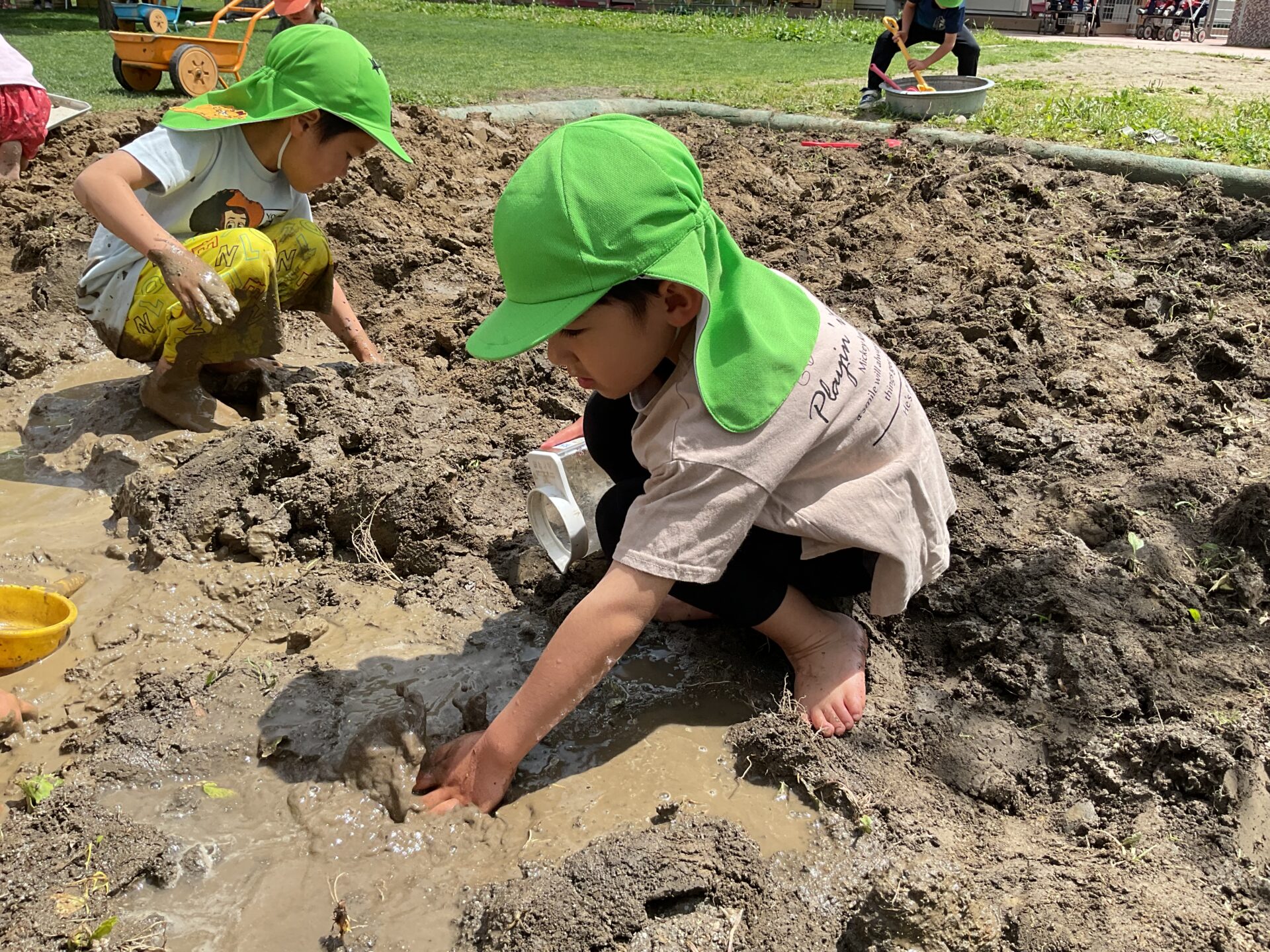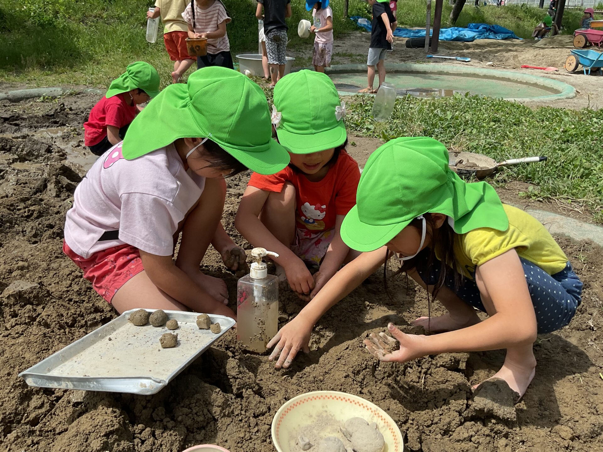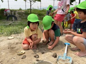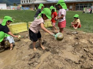 暑い日が増え、泥遊びや水遊びで盛り上がっています。