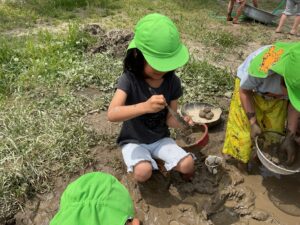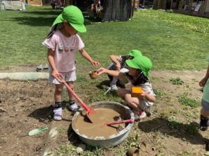 「こっちの泥の方が柔らかい」「固まっているのもあるよ」「こっちはとろとろ」と気づき、だんごやチョコレート、カレーなど、泥の様子で作りたい物のイメージが広がります。