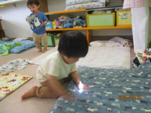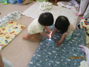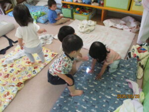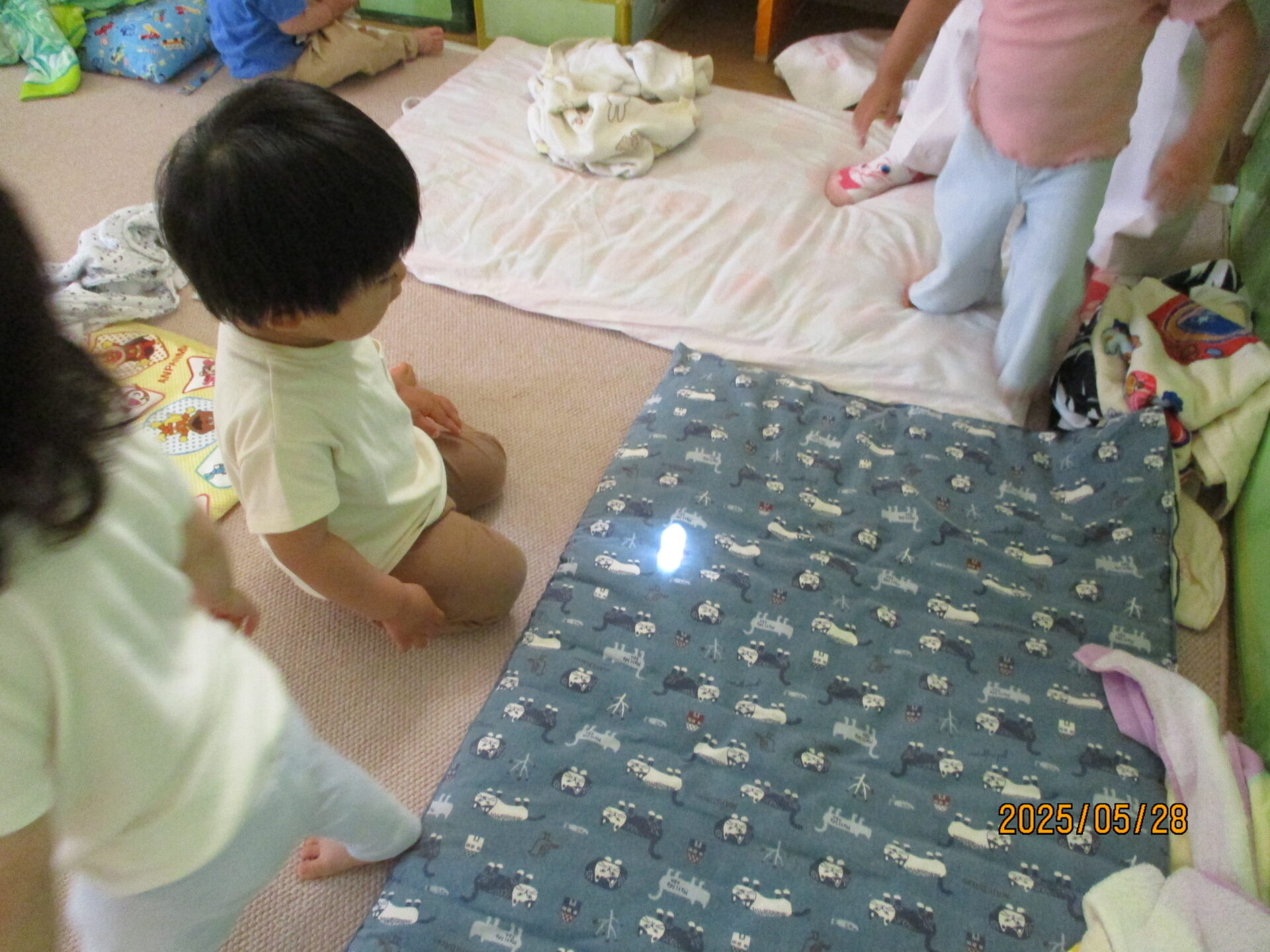布団になんだか光っているところが!「きらきら~!」他の子どもたちも集まってきました。