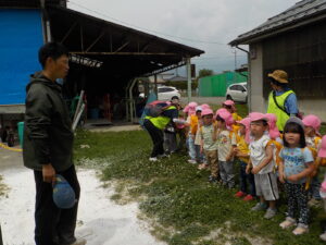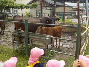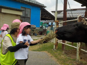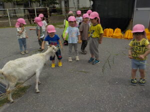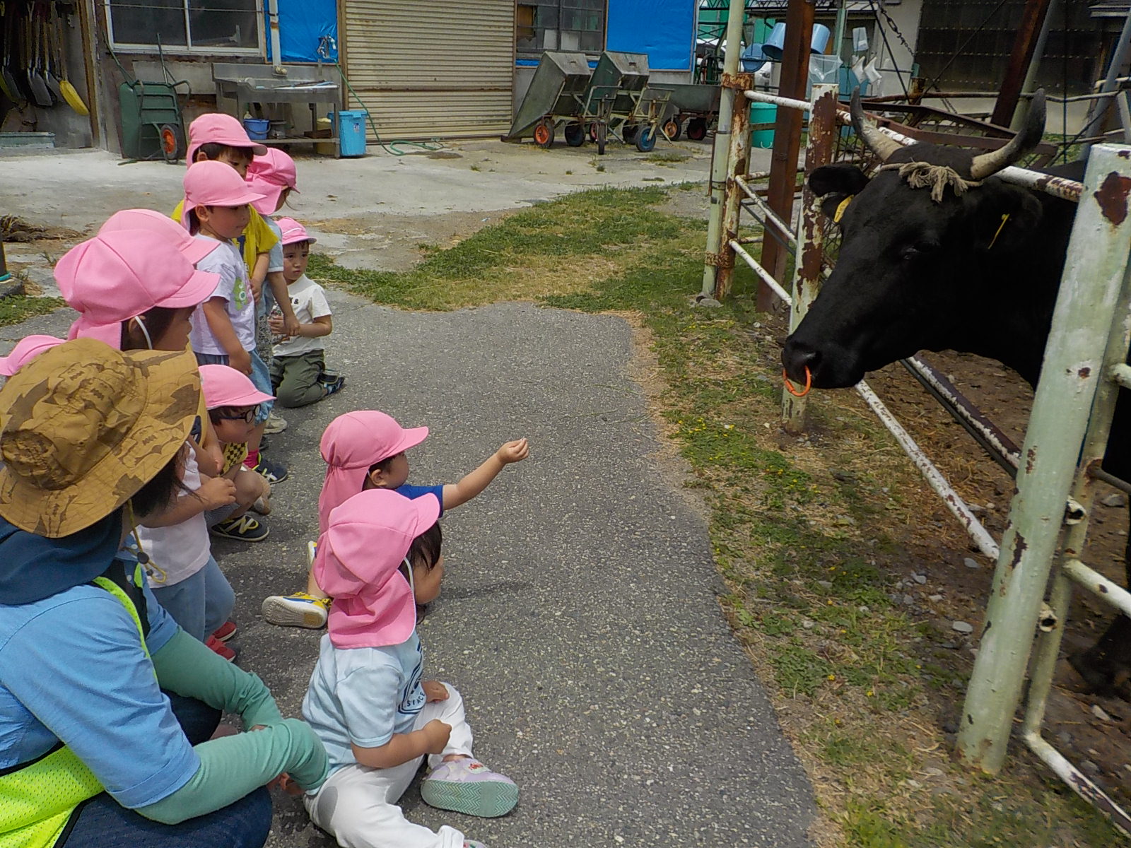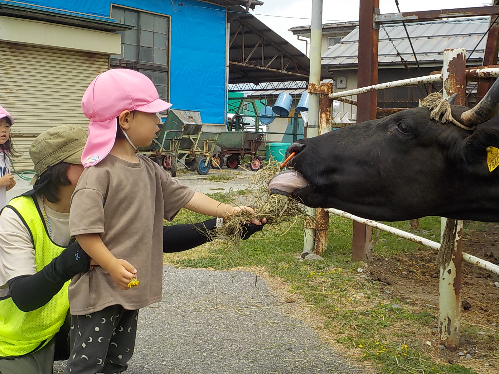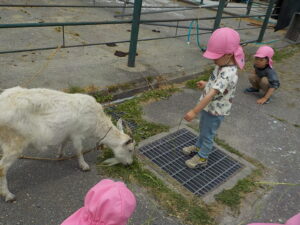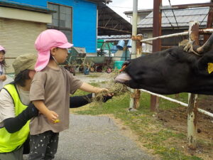 地域の交流を通して、挨拶を交わしたり、実際に牛やヤギと触れ合う体験を時々させてもらっています。「牛さん見に行きたい」「牛の赤ちゃんうまれたかなぁ」と次に会える時を楽しみにしている姿も日々の中でたくさん見られています。