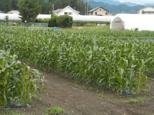 「あっちはトマト、あれがネギ。レタスにトウモロコシだよ。」