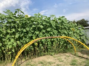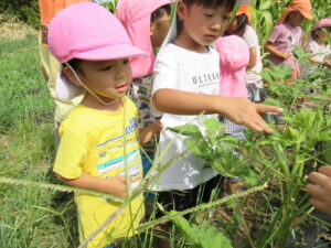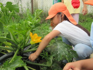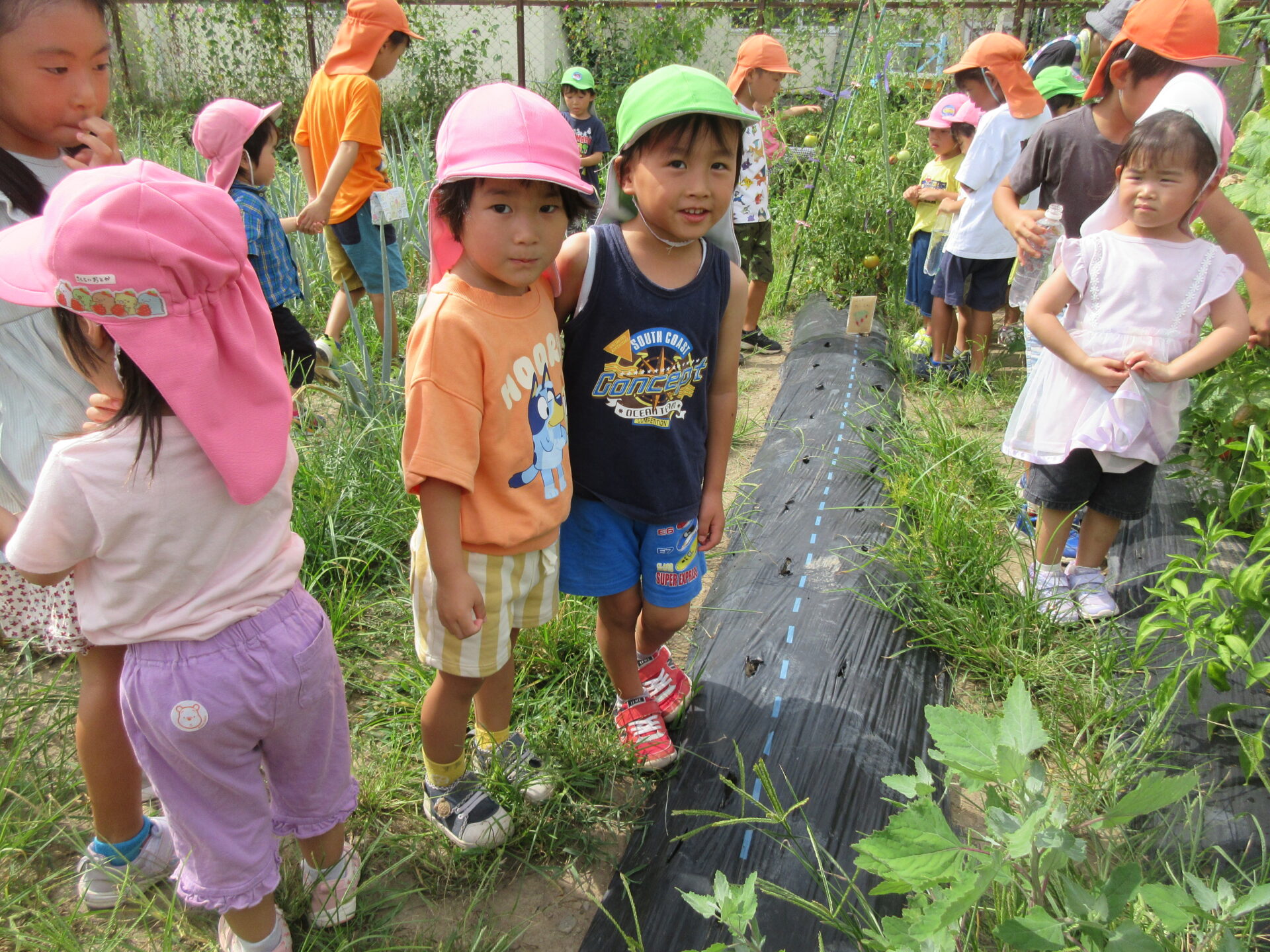 ・畑へ行くと「小さい実ができてる」「草がこんなに大きくなってる」と野菜が生長する速さに驚く姿がありました。