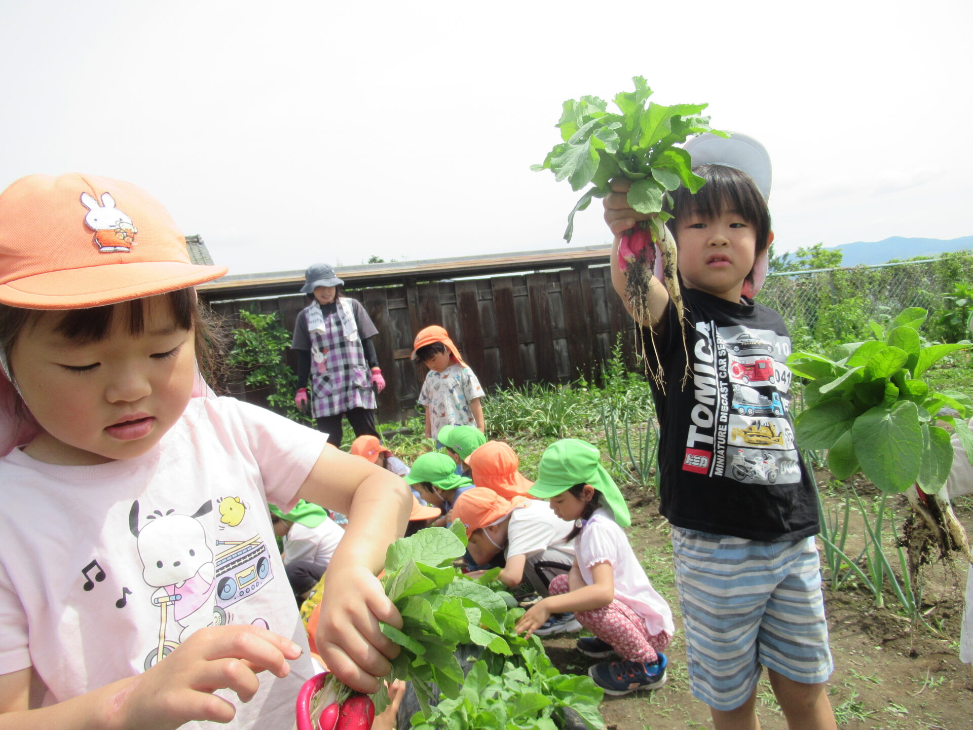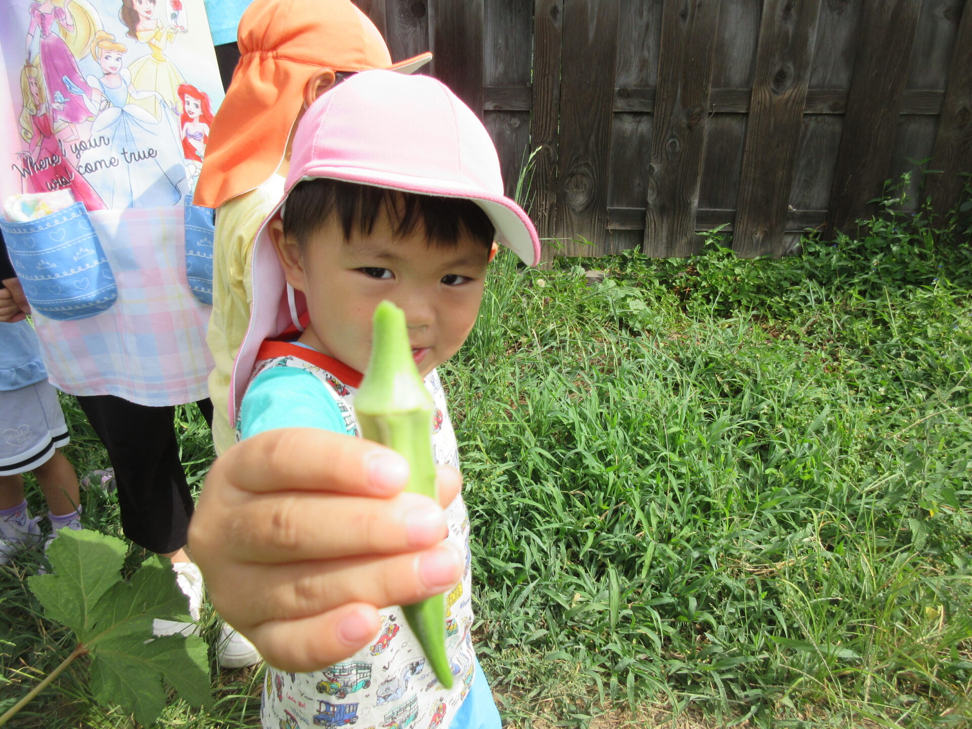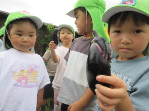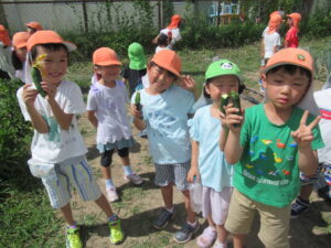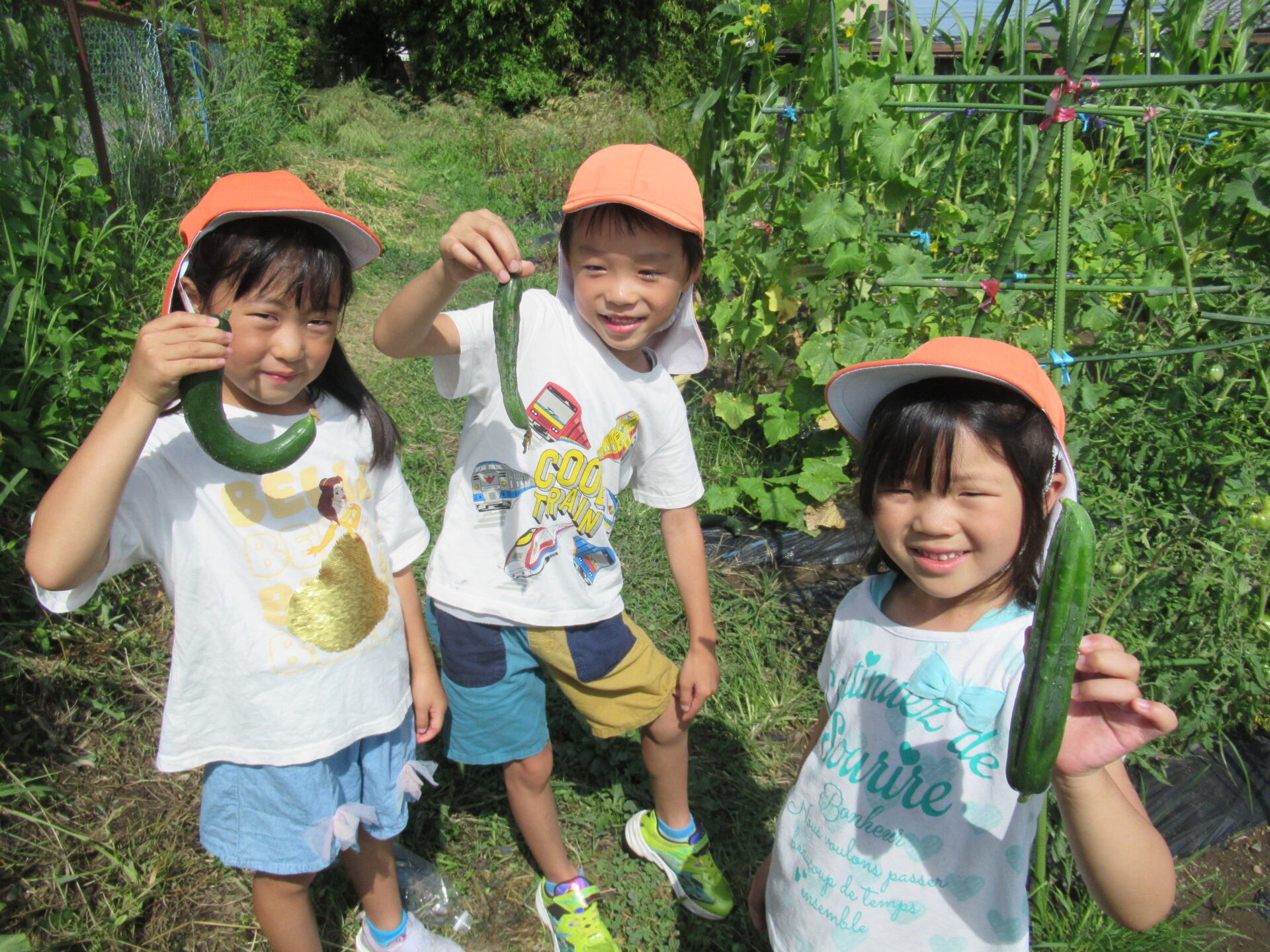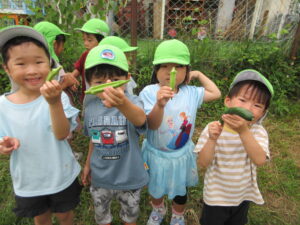 毎朝、体操の前に畑へ行き野菜の収穫や水くれ、雑草抜きをしています。雑草がなかなか抜けない時はお友達と協力して大きなかぶのように「うんとこしょどっこいしょ」と抜いていました。畑へ行く度に大きくなる野菜を見て「きのうはちいさかったのにもうおおきくなってる!」と驚いていました。自分たちで収穫した野菜が給食に出てきた時は、とても喜んで食べていました。