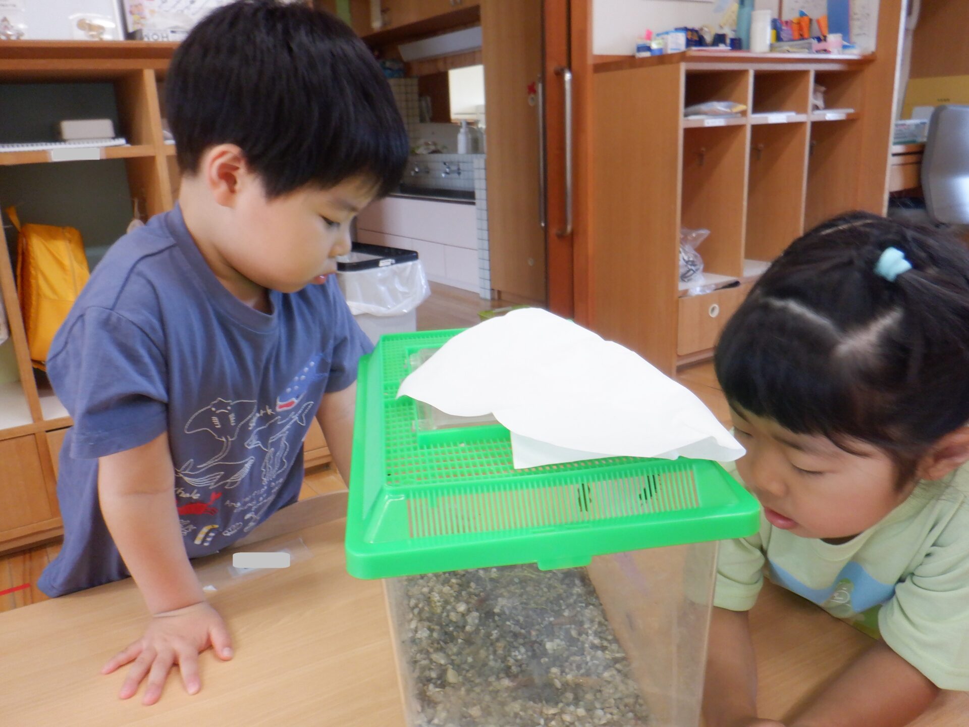 さなぎは、キラキラ光っているところがあり、子ども達は興味深く眺めていました。