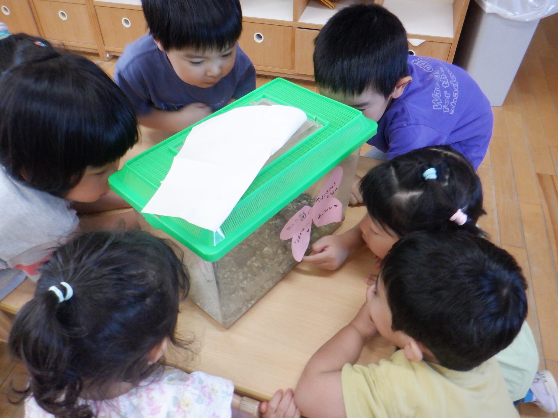 幼虫がさなぎになり、そして蝶々に変身することを、クラスで飼育することで自分たちの目で見て知ることができました。
