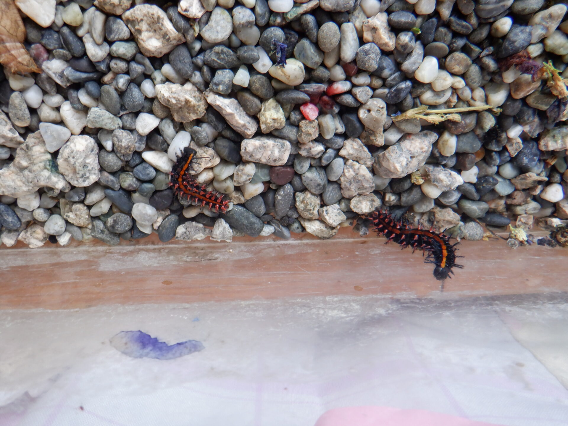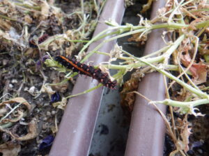 調べると「ツマグロヒョウモン」の幼虫で、蝶々になると判明‼ クラスで飼育してみることにしました。