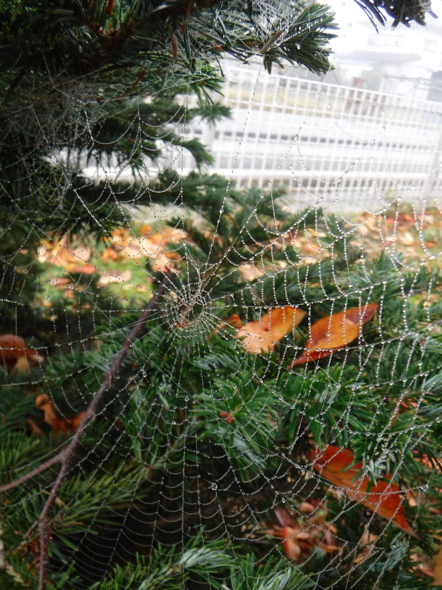 寒いけどいつものように外に出たら普段見ている木に ✨キラキラくもの巣が・・