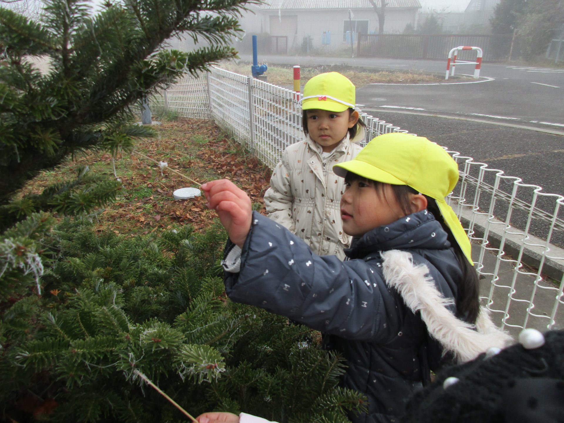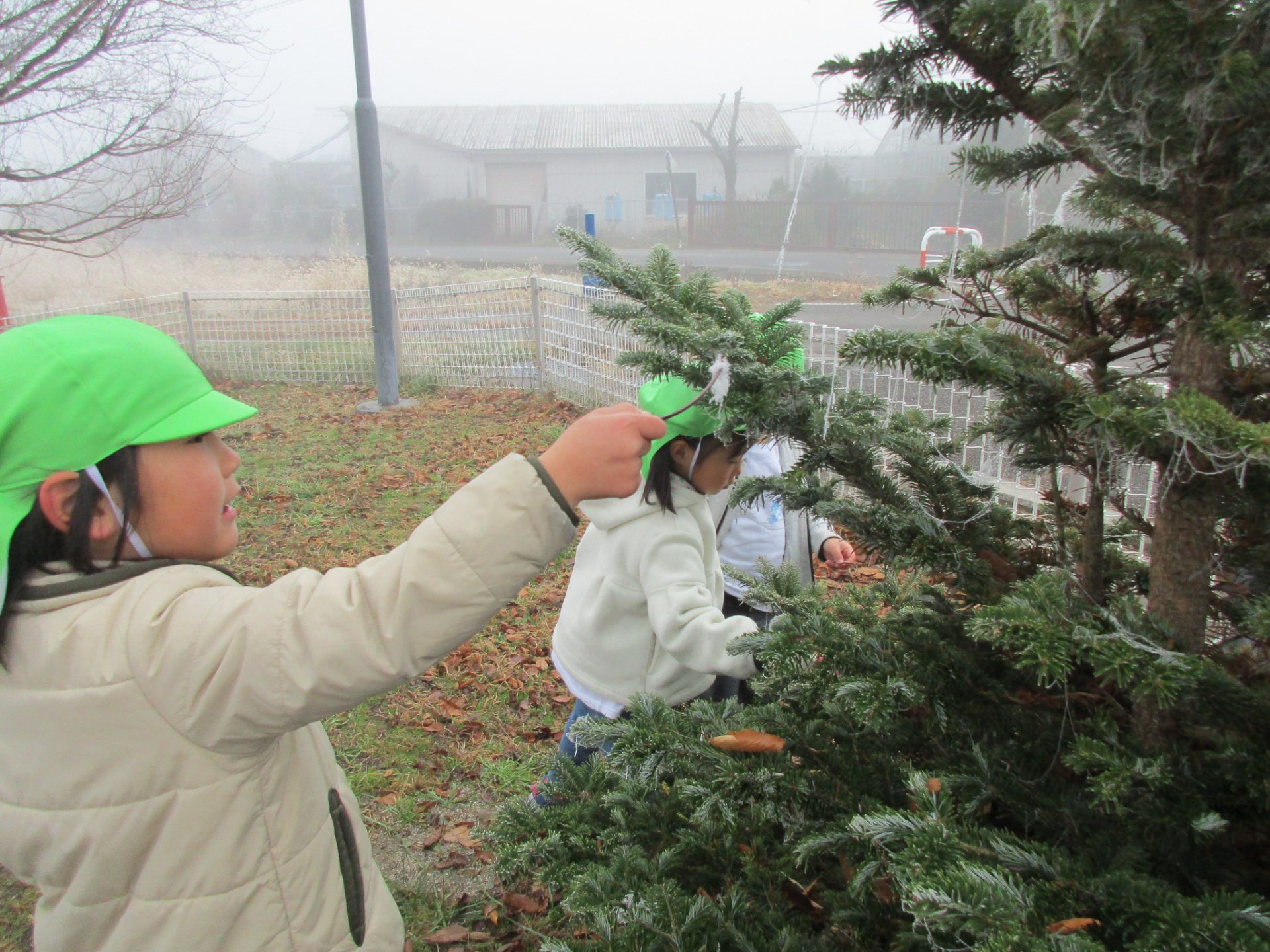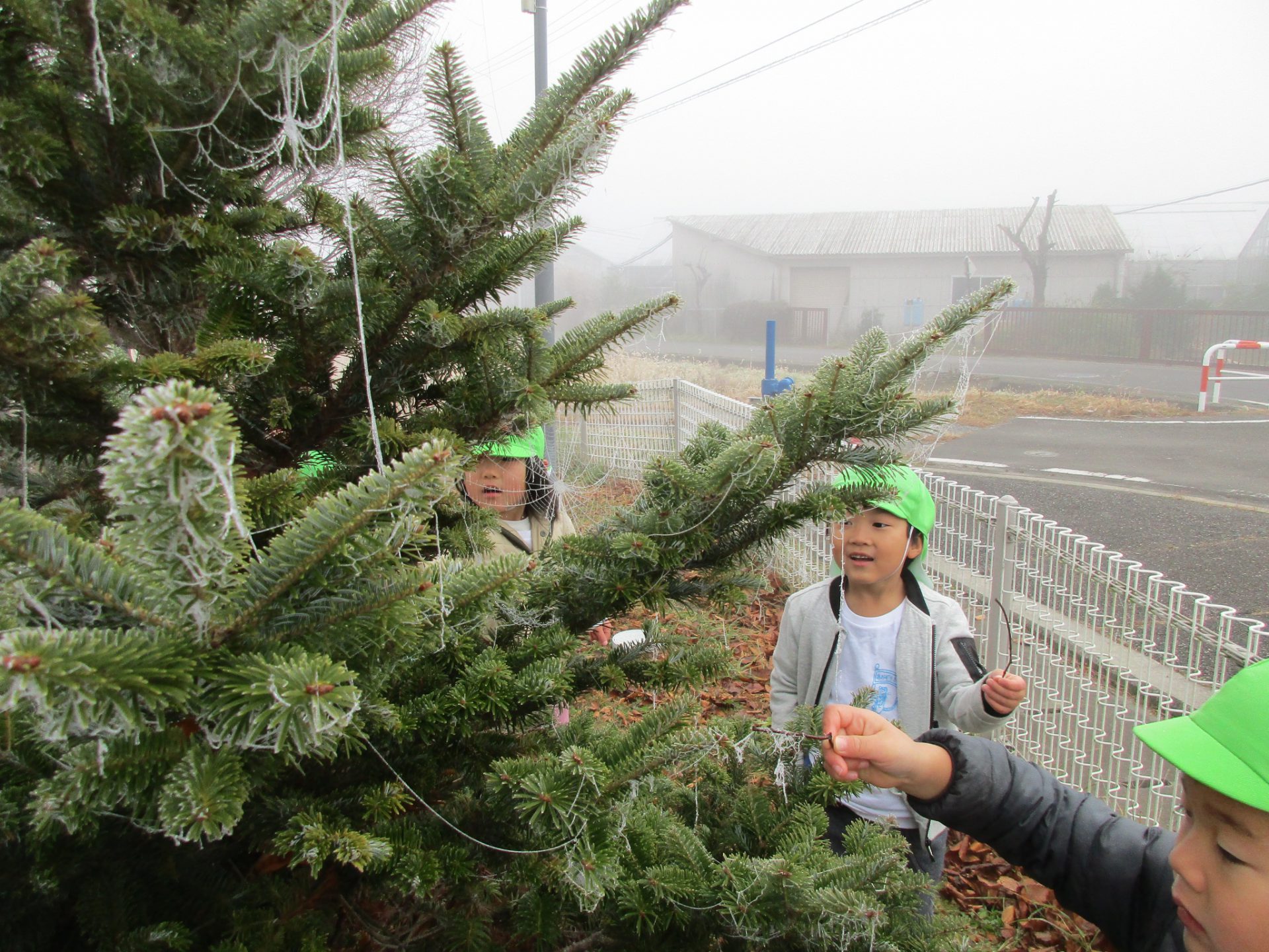 くもの巣が霜をつけてキラキラとしている様子に子ども達もビックリ!!雨上がりのくもの巣の様子に気づいた事から、子どもたちも目についたのかもしれません。くるくる巻いてみたりアイスクリームやわたあめにしてみたり、もみの木にキラキラした雰囲気からでしょうか、クリスマスツリーみたいとの声も聞かれ冬を迎える気持ちも表れていた事かと思います。