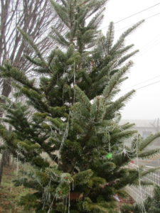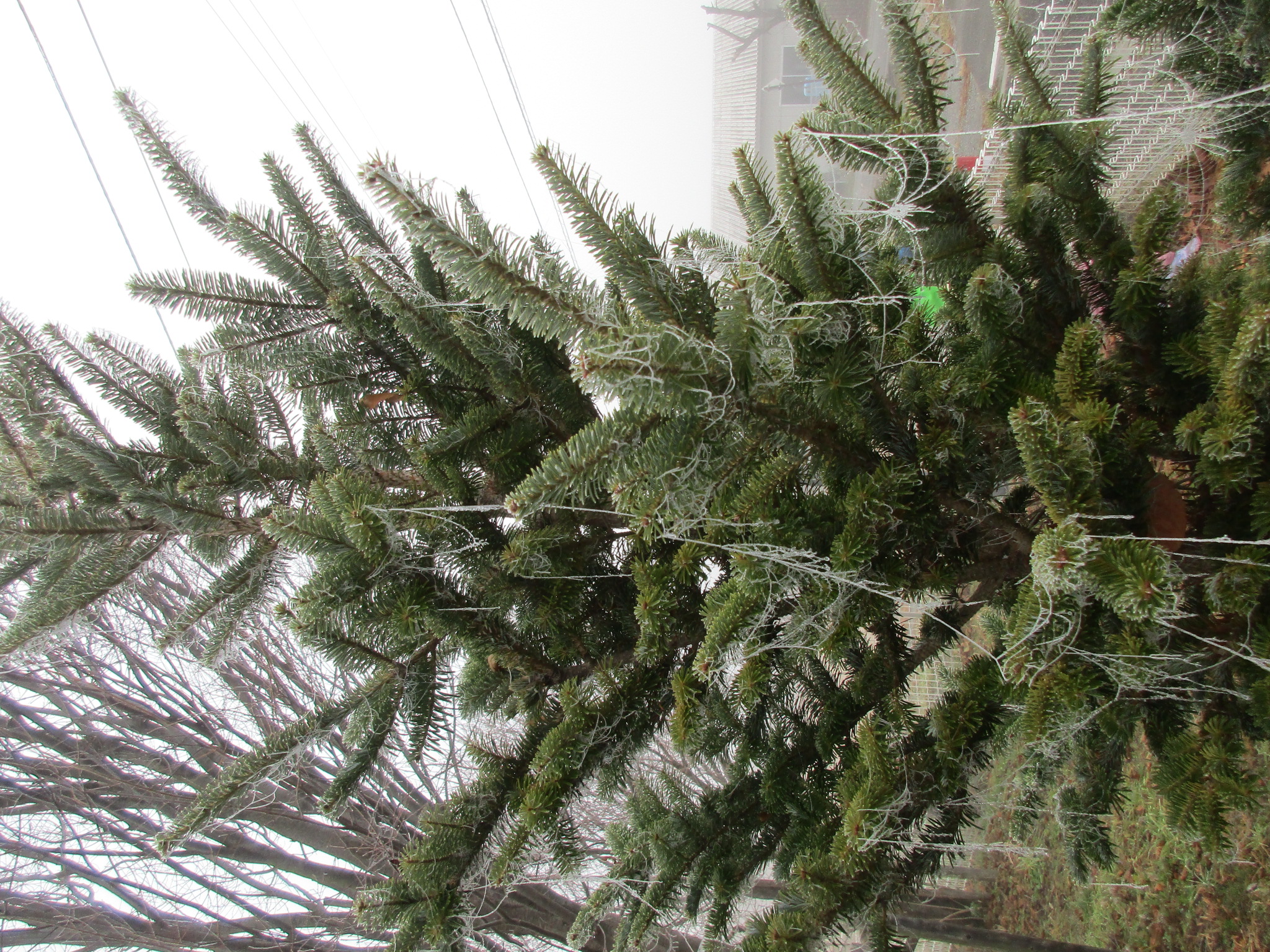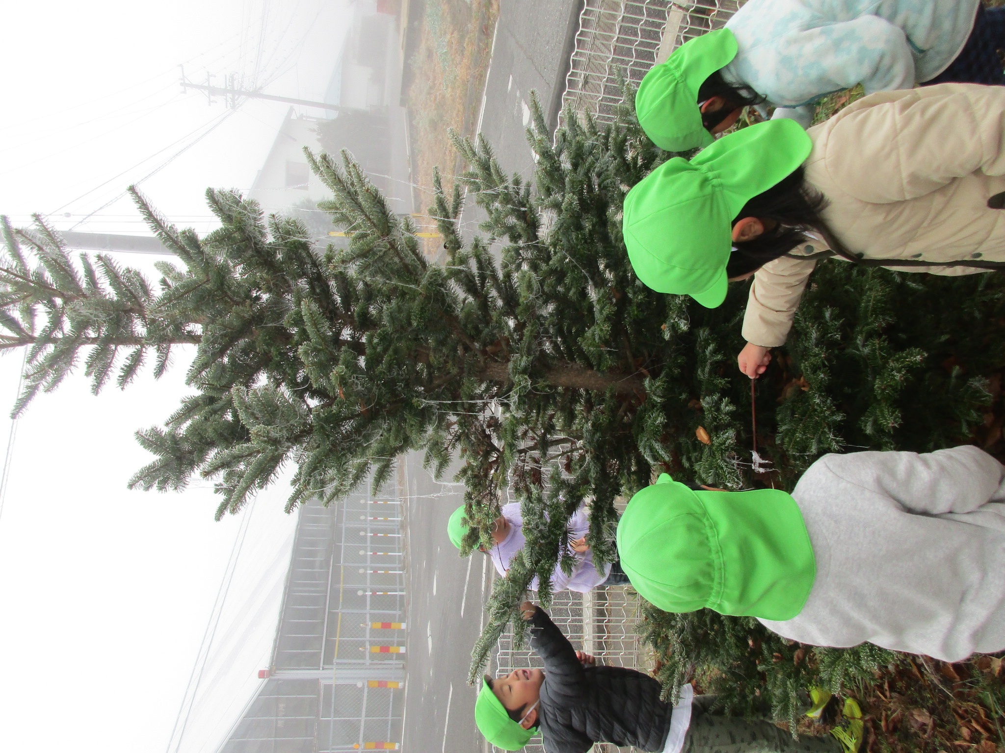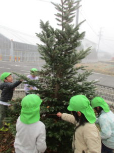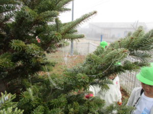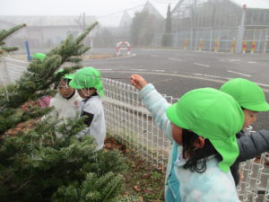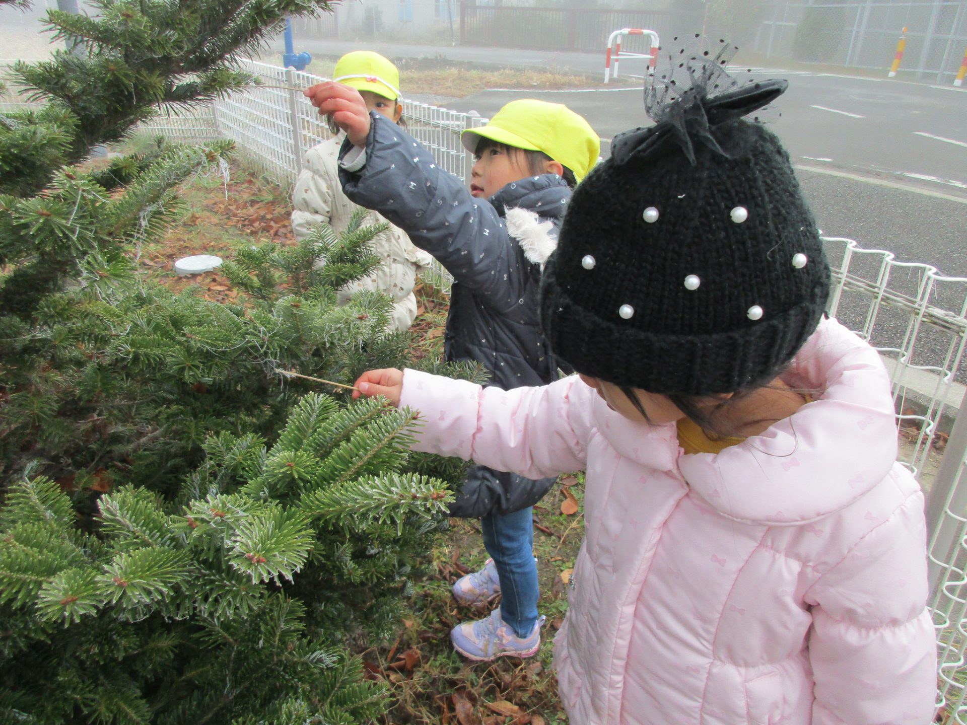 くもの巣が霜をつけてキラキラとしている様子に子ども達もビックリ!!雨上がりのくもの巣の様子に気づいた事から、子どもたちも目についたのかもしれません。くるくる巻いてみたりアイスクリームやわたあめにしてみたり、もみの木にキラキラした雰囲気からでしょうか、クリスマスツリーみたいとの声も聞かれ冬を迎える気持ちも表れていた事かと思います。