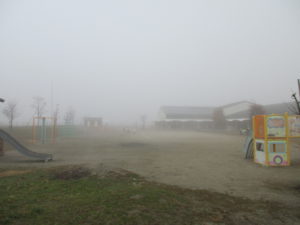 今朝は霧がまいてどこに何があるかぜーんぜん見えません。
