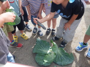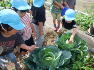 キャベツを収穫したとき「わ~!!」「キャベツのにおいがする!」