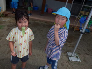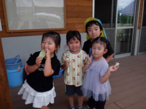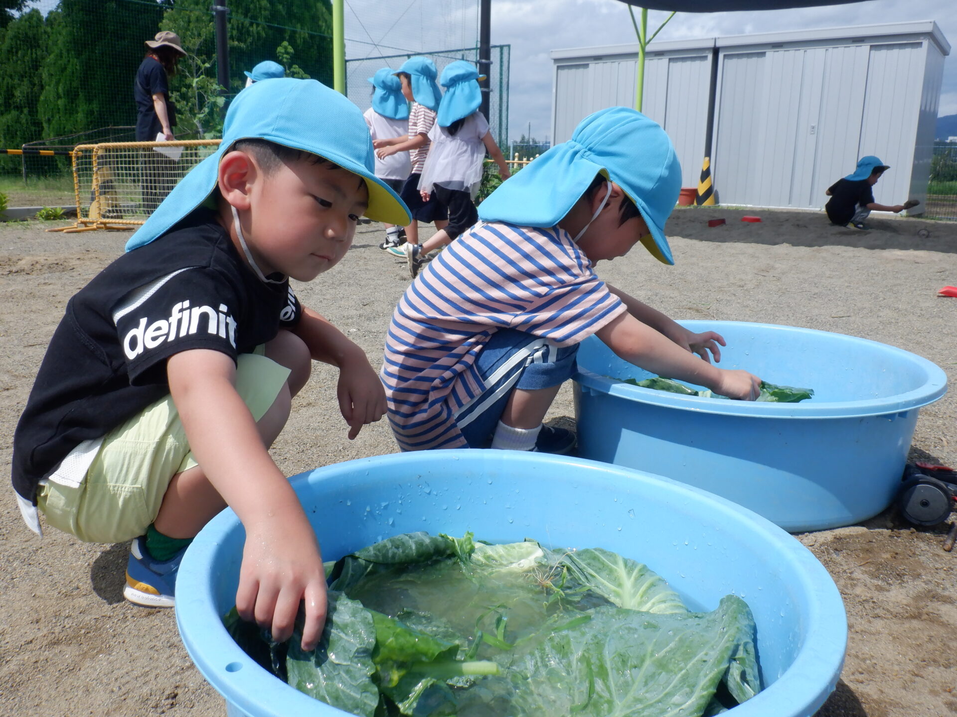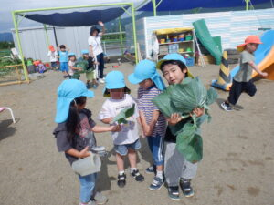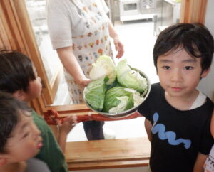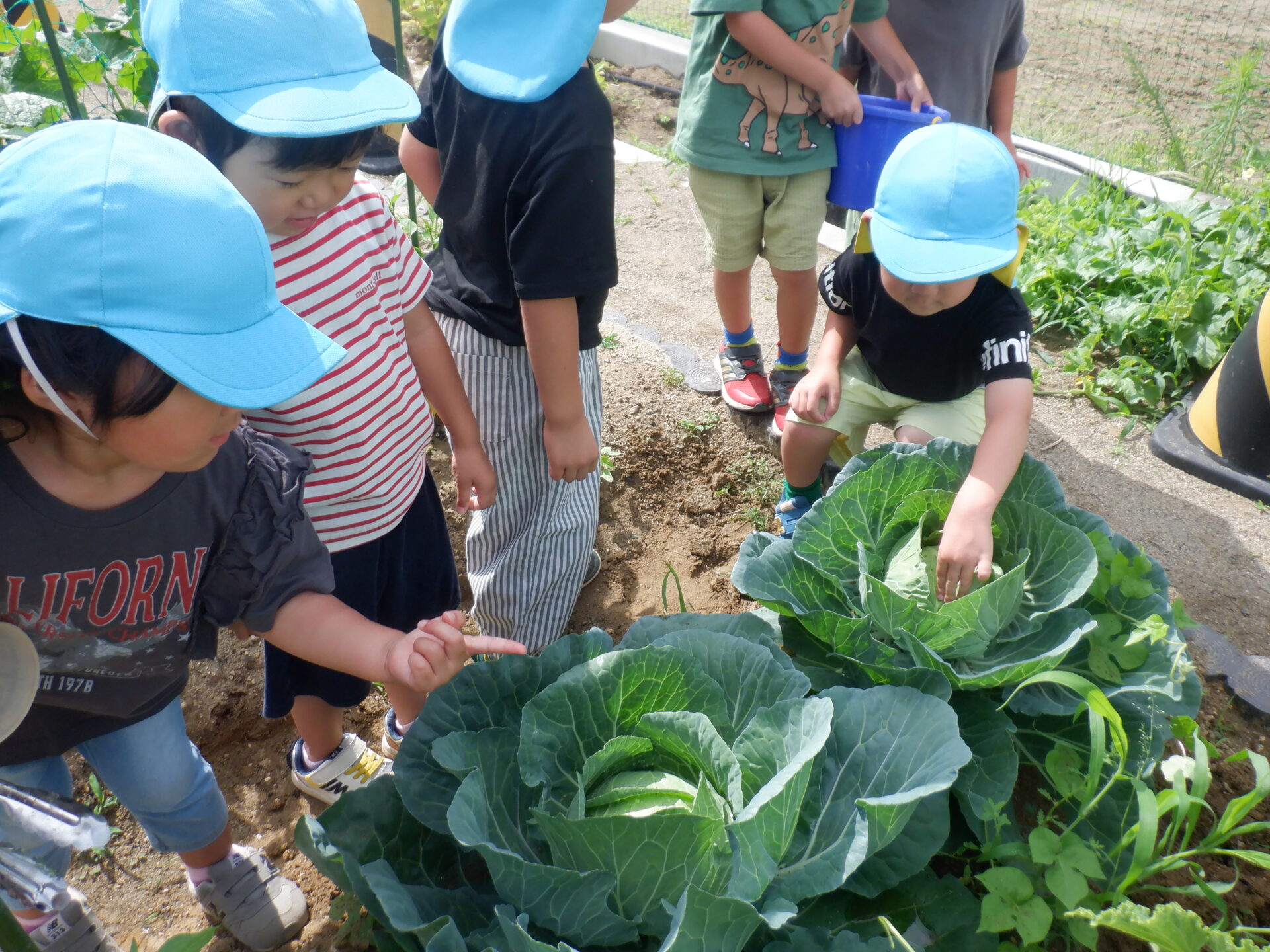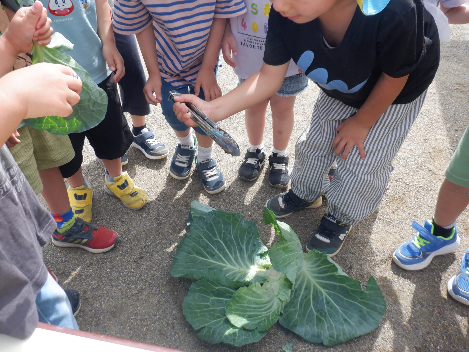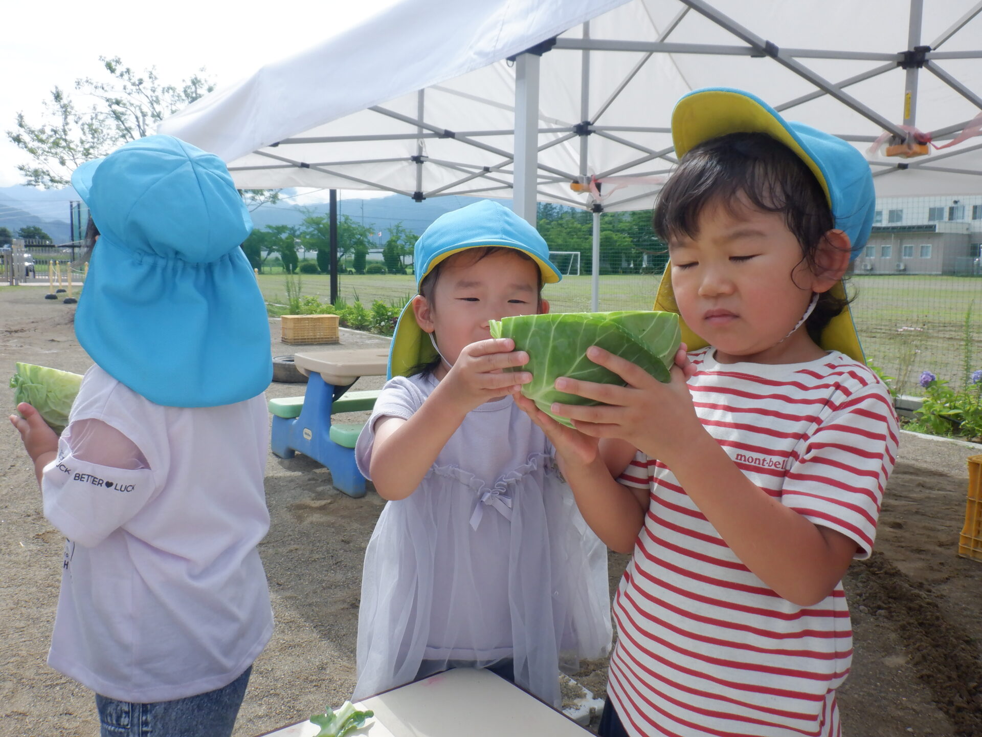 ・年少児の時「キャベツを育てたい!」から始まり、年中児でも「野菜なに?作りたい?」と聞くと「キャベツを育てたい!」という声が、、、。年少児の時の経験をいかして、キャベツの収穫祭!を楽しみにして、葉っぱの不思議を知ったり、収穫した野菜をすぐに味わったり、年少児の時よりも気づくことが多く、キャベツの成長と共に親子との会話も増えたり、良い経験ができました。また、子ども達の声を聞いて、明日も保育園行きたい保育ができたらと思います。