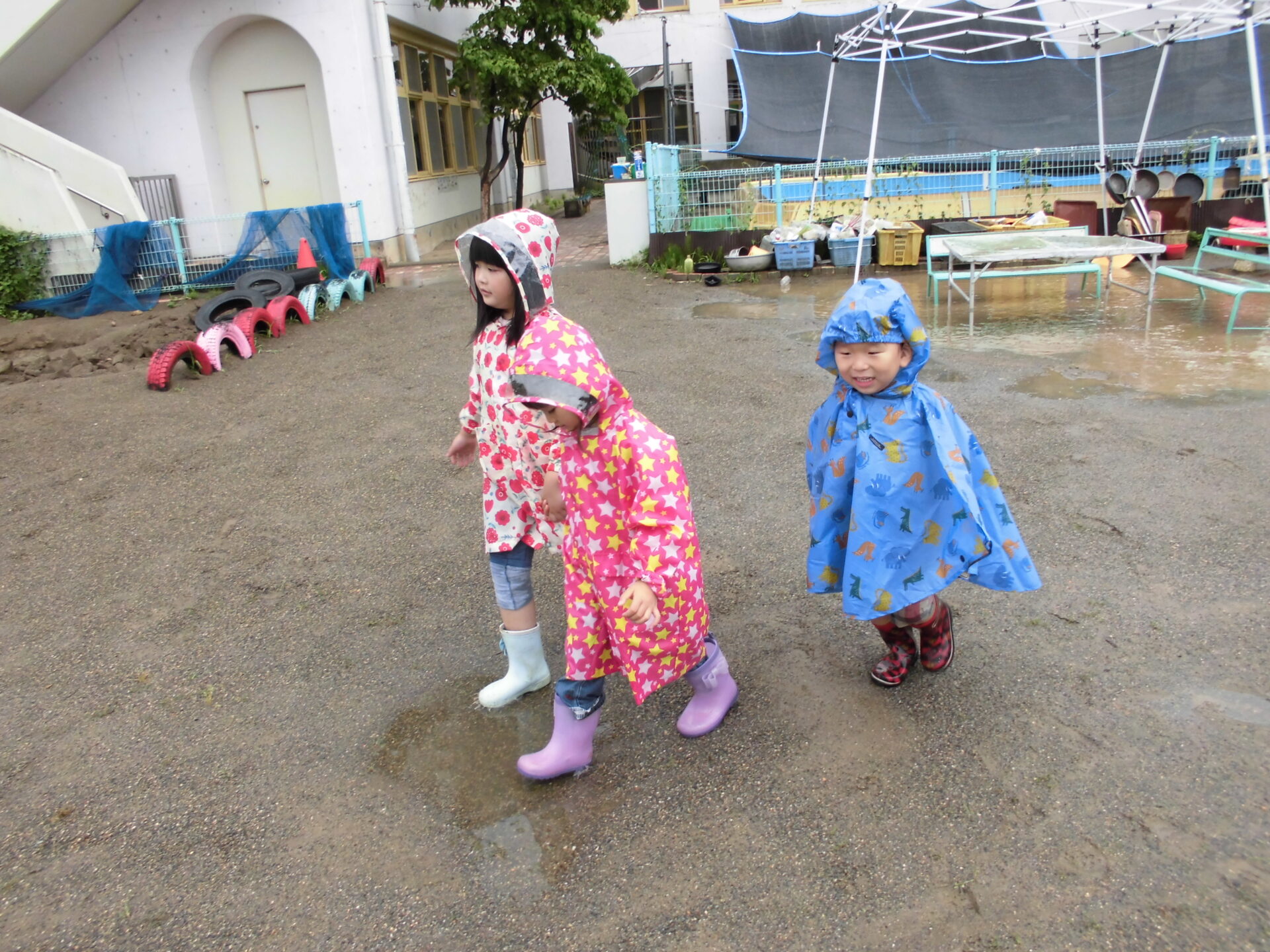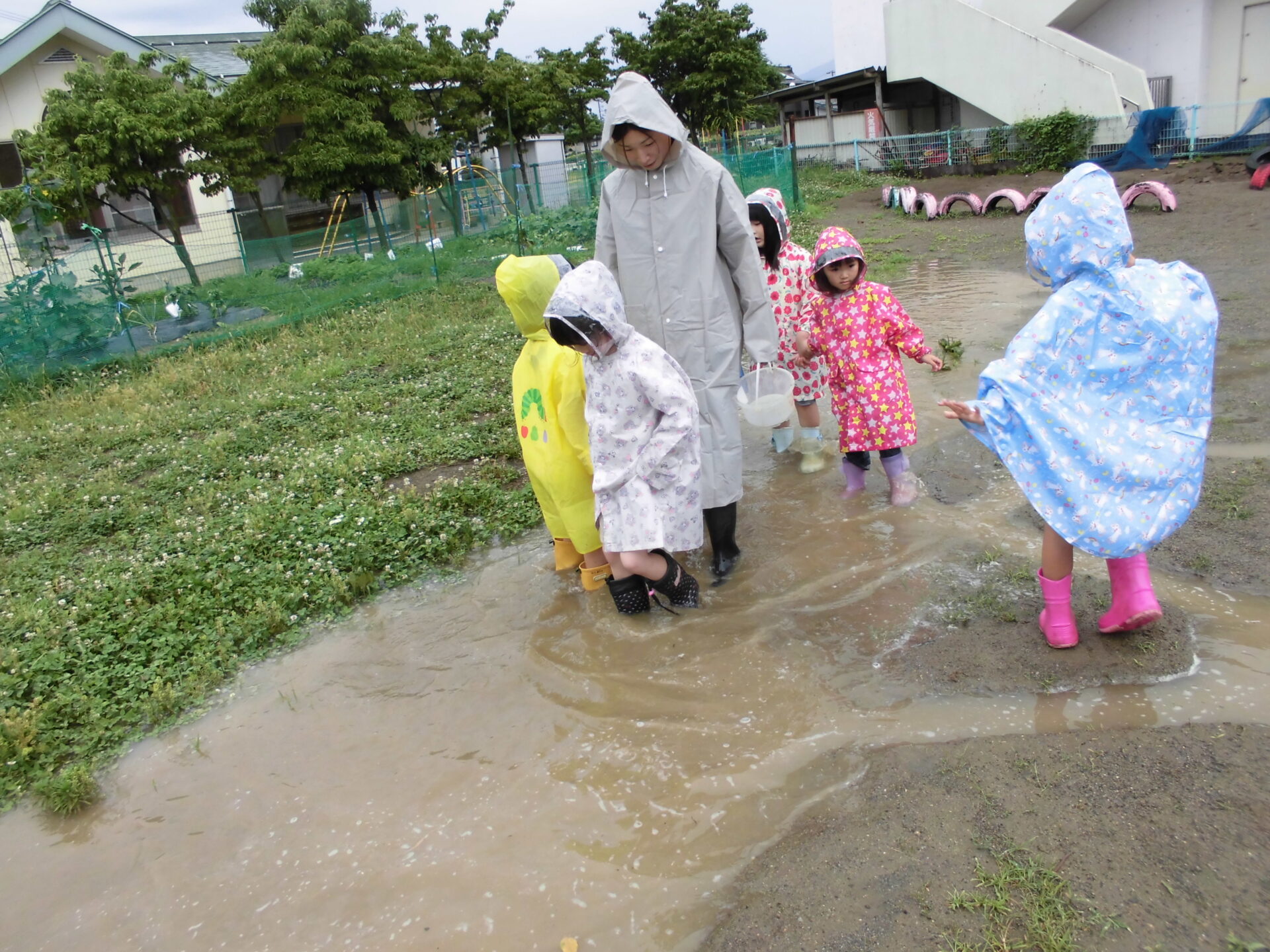 雨だとやりたかった遊びができずに残念そうにする子もいますが、『雨の日も楽しい!』と思ってほしいと願い、梅雨前から全員カッパを用意してもらっていました。